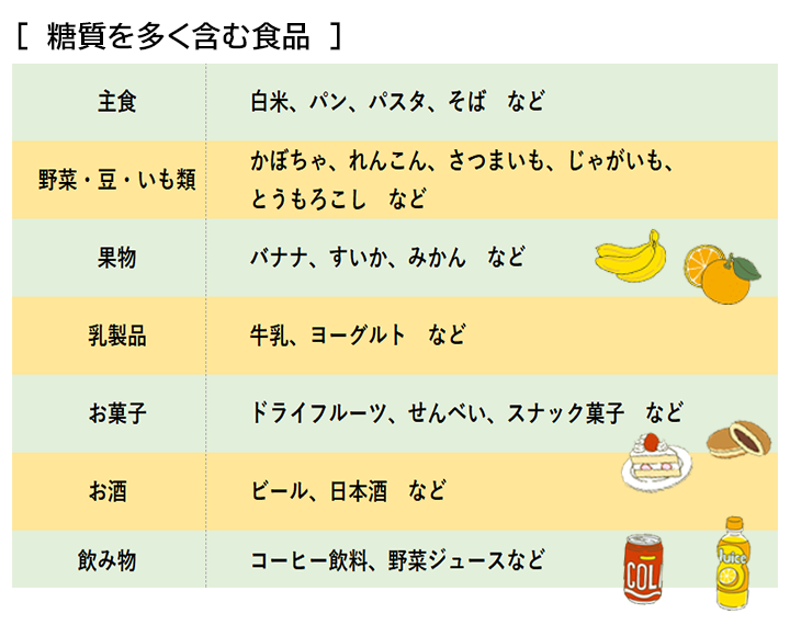 糖質は甘いものや主食に多く含まれていますが、野菜や果物でも糖質を多く含むものがあるので要注意です。