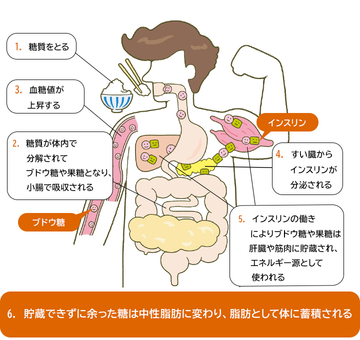 消費しきれず余った糖は中性脂肪に変換され、脂肪として体に蓄えられてしまいます。