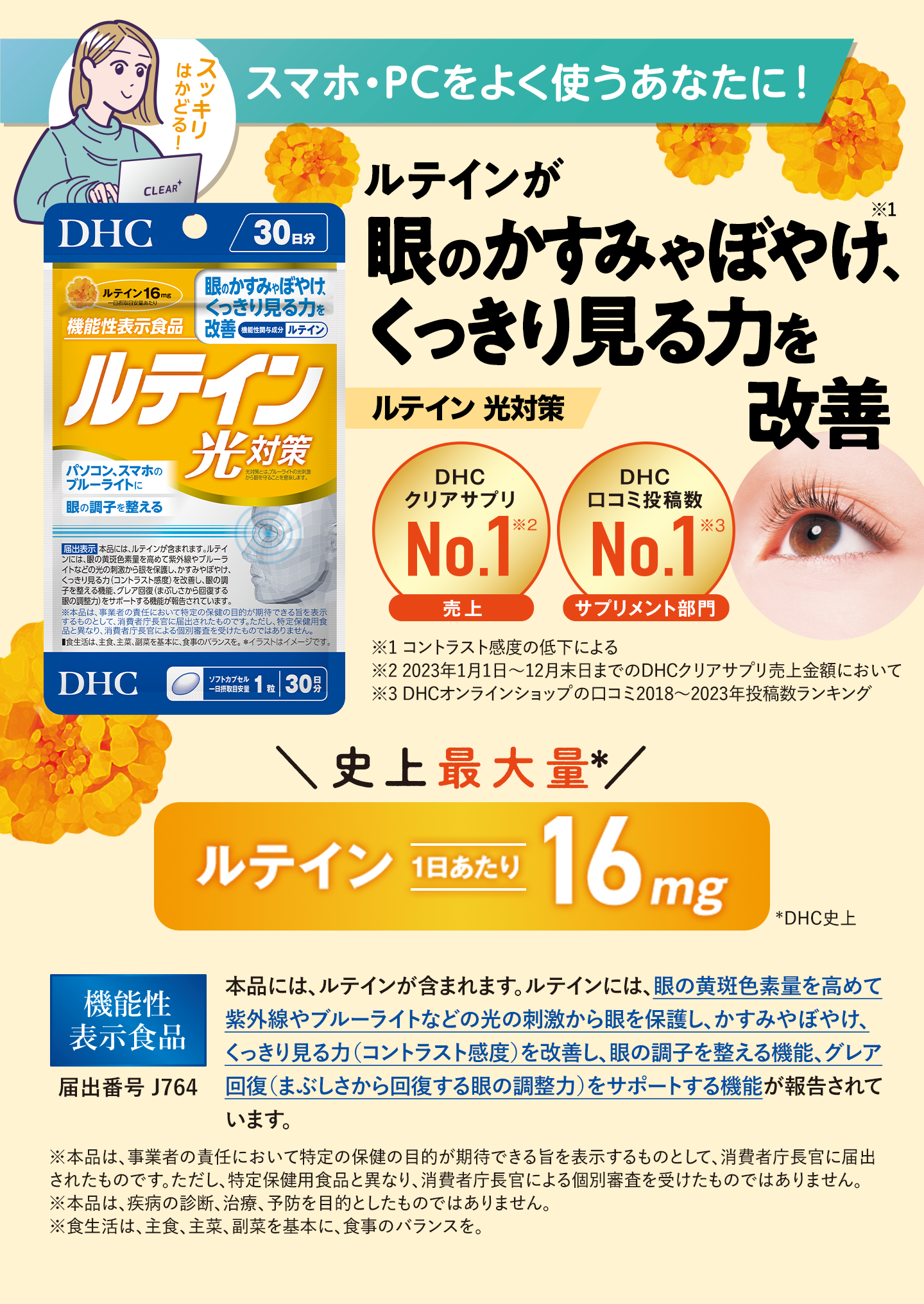 紫外線やブルーライトなどの光刺激から眼を守り、かすみやぼやけ、くっきり見る力を改善!