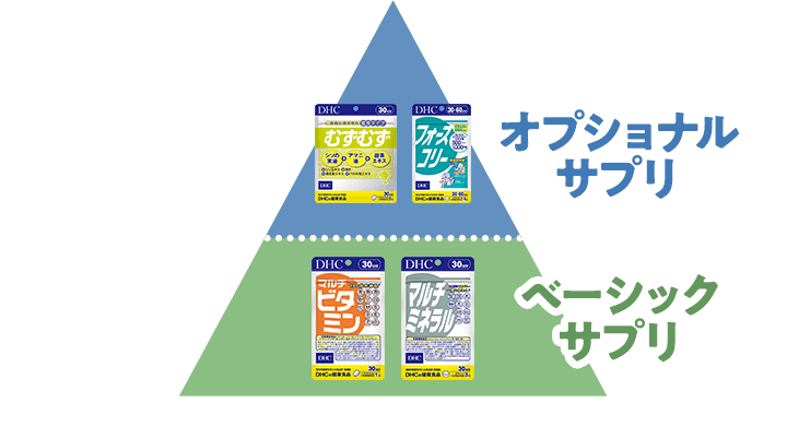 食事の補助として、ビタミンやミネラルなどのベーシックサプリを。体調や季節、お悩みにあわせてとりたい成分をオプショナルサプリから選んでみてください。