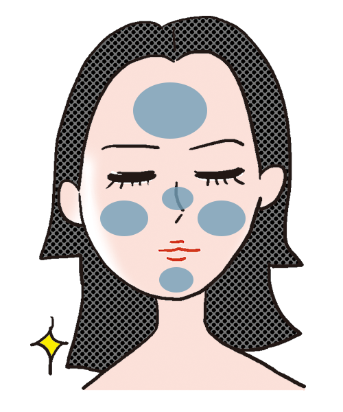適量を手にとったら、両頬、額、鼻、あごの5点に置き(青のエリア)、顔の中心から外側に向かってなじませます。日やけしやすく、日やけ止めが落ちやすい部位なので重ね塗りがマスト。