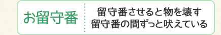 一人で留守番させると物を壊す・留守番の間ずっと吠えている・留守番させると家中におしっこやウンチをする・一人になると自虐的に自分の手やしっぽなどをかじる・いつも飼い主の動きを気にしている
