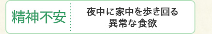 狭いところに入り込み後退できず出られなくなり騒ぐ・夜になると遠吠え(夜鳴き)をする・夜中に家中を歩き回る・急に驚いて吠える・異常な食欲