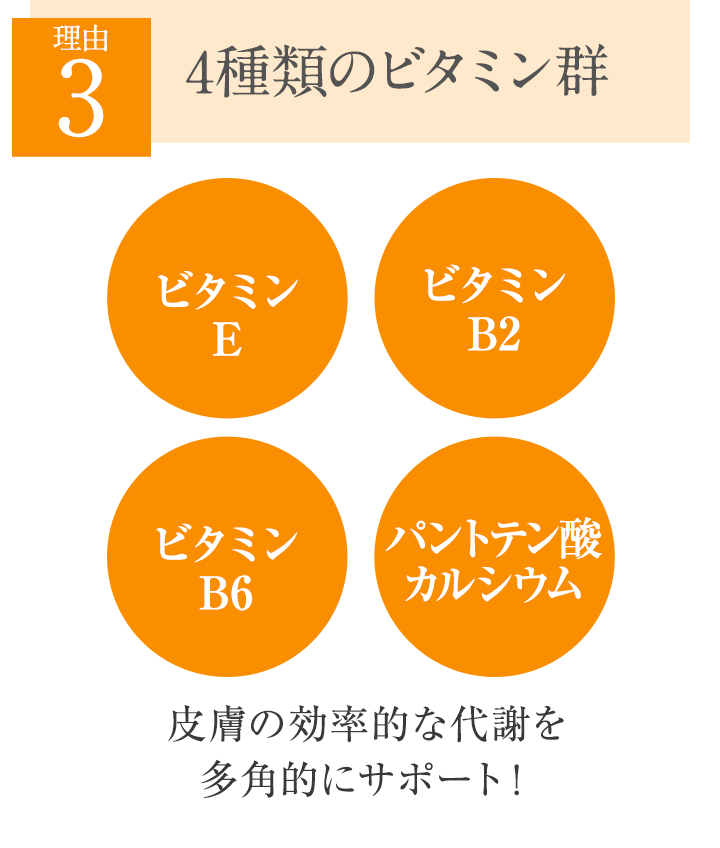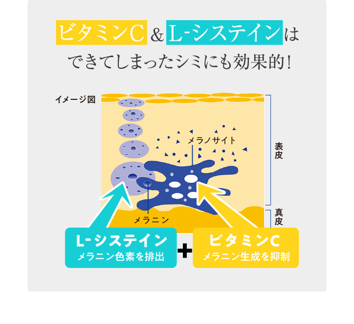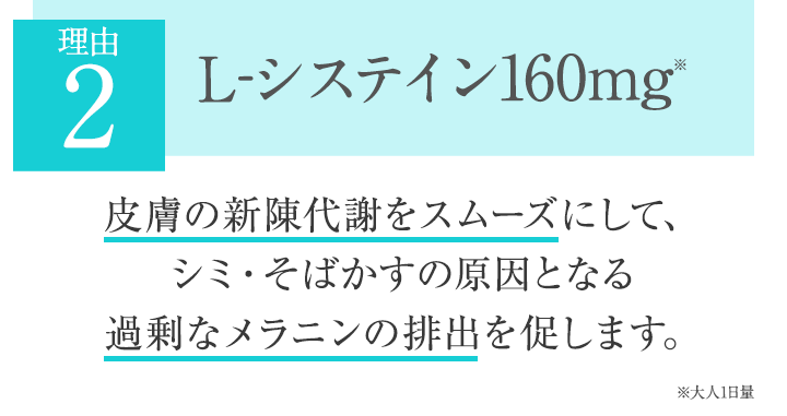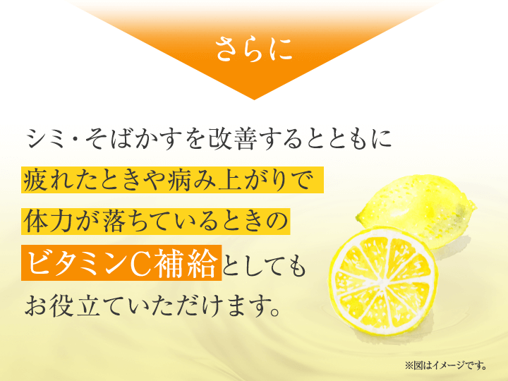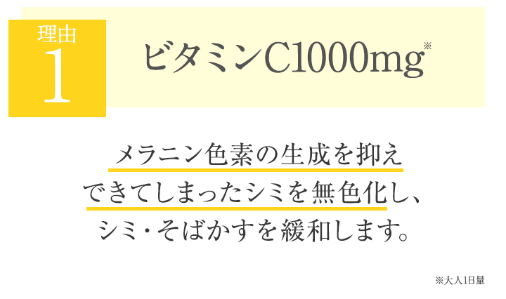 アスコルビン酸(ビタミンC)…1000mg、L-システイン…160mg、ピリドキシン塩酸塩(ビタミンB6)…30mg、リボフラビン(ビタミンB2)…12mg、酢酸d-α-トコフェロール(ビタミンE)…25mg、パントテン酸カルシウム…24mg