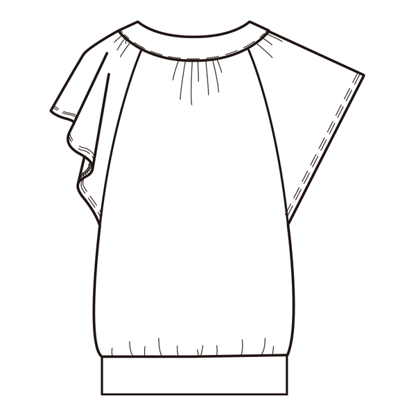 身体の厚み分を衿まわりのギャザー分量で調整することにより、バランスよく見せることができました。袖のフレアや、ウエストのブラウジングでさらにすっきりと見えます。