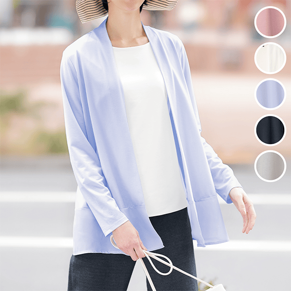 ヒップまでカバーできるミディ丈のUVカット機能付きカーディガン。裾まわりにきれいなドレープが出るデザインで、羽織るだけでエレガントな着こなしがキマります。