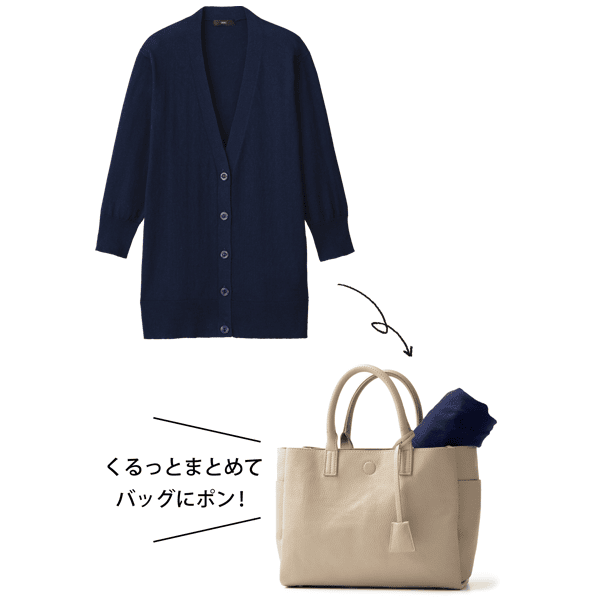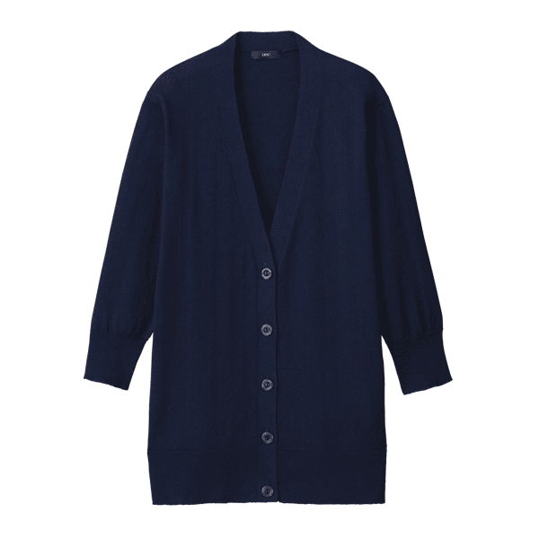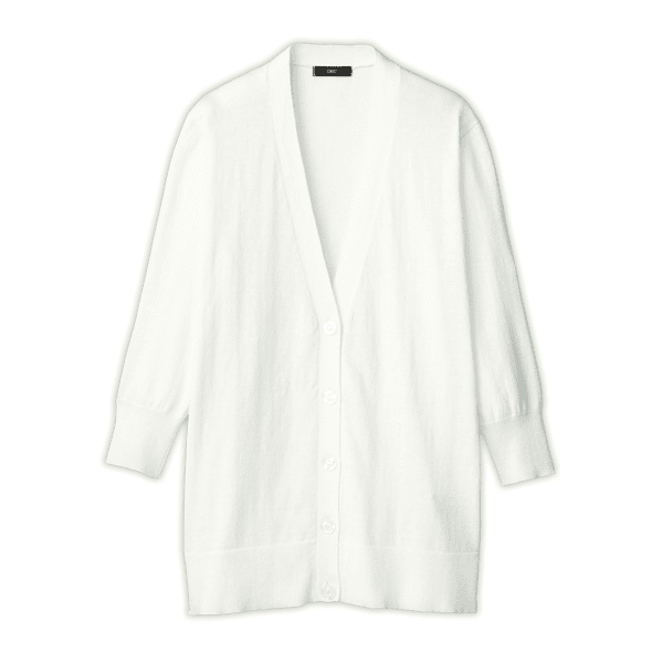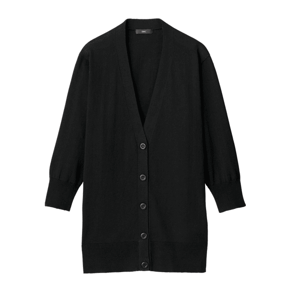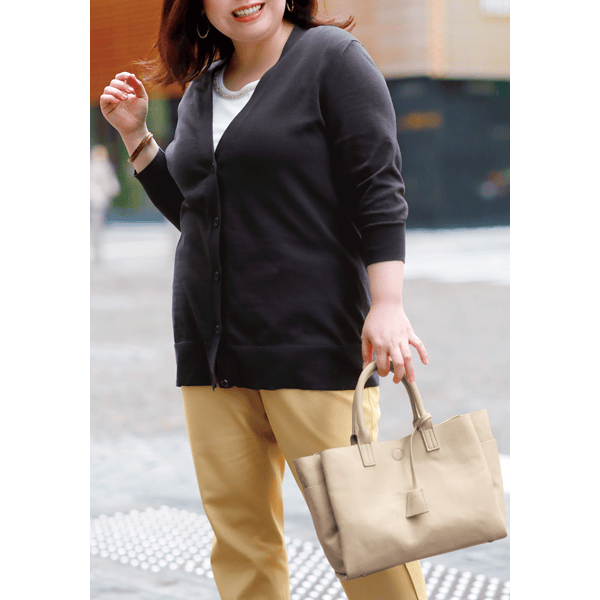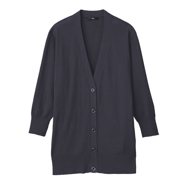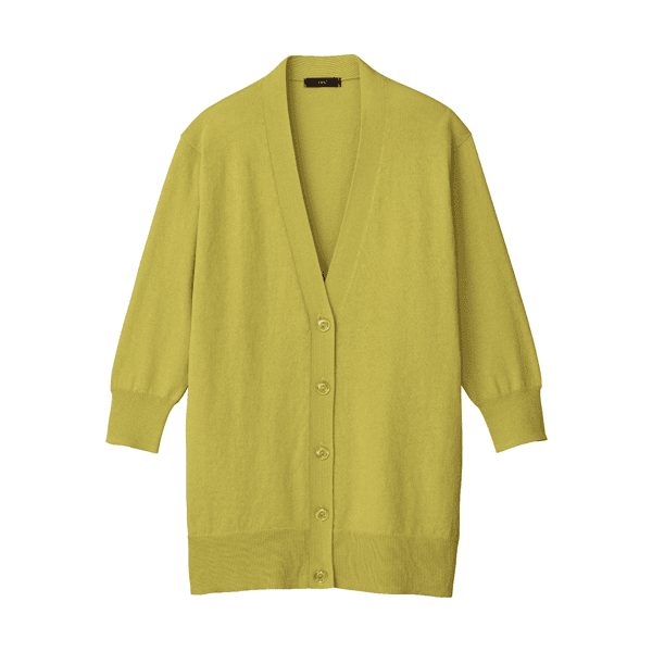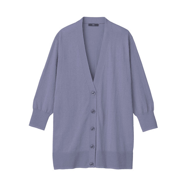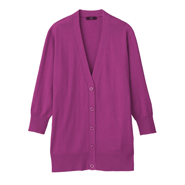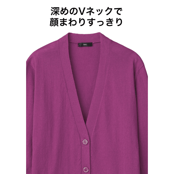 軽やかに着られる薄手カーディガン。深いVネックとヒップが隠れる長め丈が、縦ラインを強調しすっきり見えます。脇線を後ろにし、前身頃に分量を増やし前裾が上がらないようにしています。