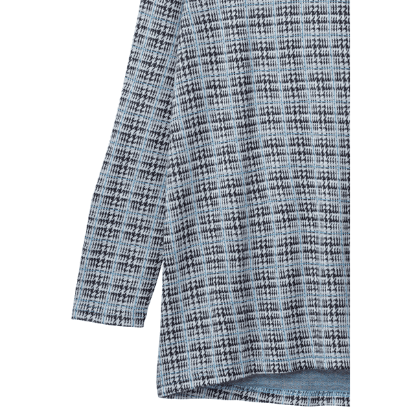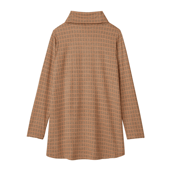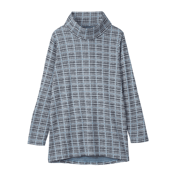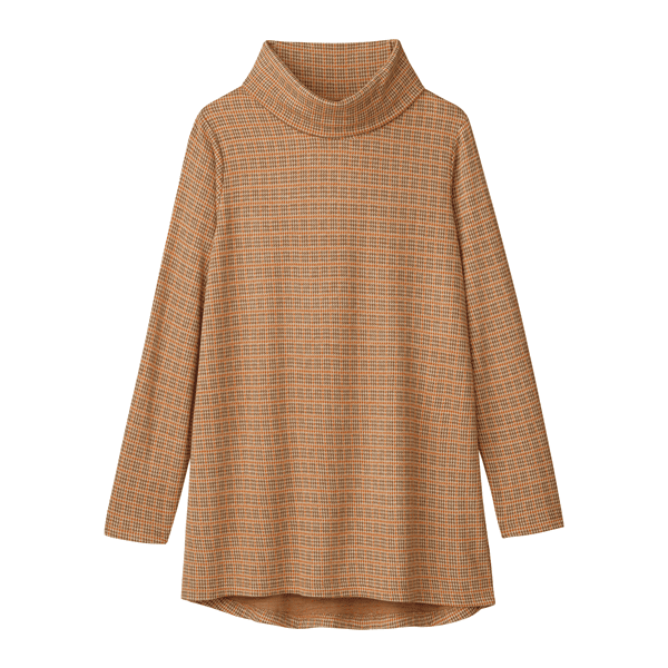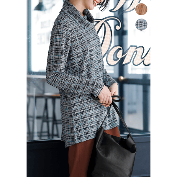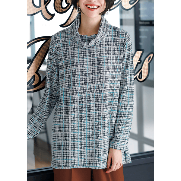 ジャカード編みによりチェック柄を表現したカットソー。後ろ下がりにラウンドした裾のラインで、ヒップまわりまでカバーするロング丈です。ゆとりのある大きめのオフタートルで小顔見えに。