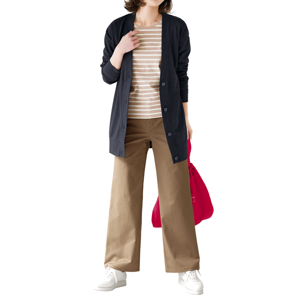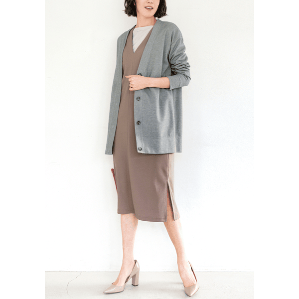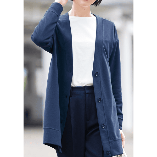 ヒップを隠せるロング丈のカーディガン。リラックス感あるオーバーサイズで中に着る物を選びません。キレイめのジャージー生地でカジュアルになりすぎず、きちんと感もあります。