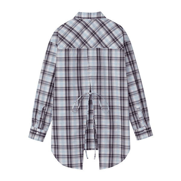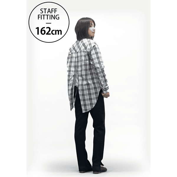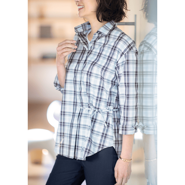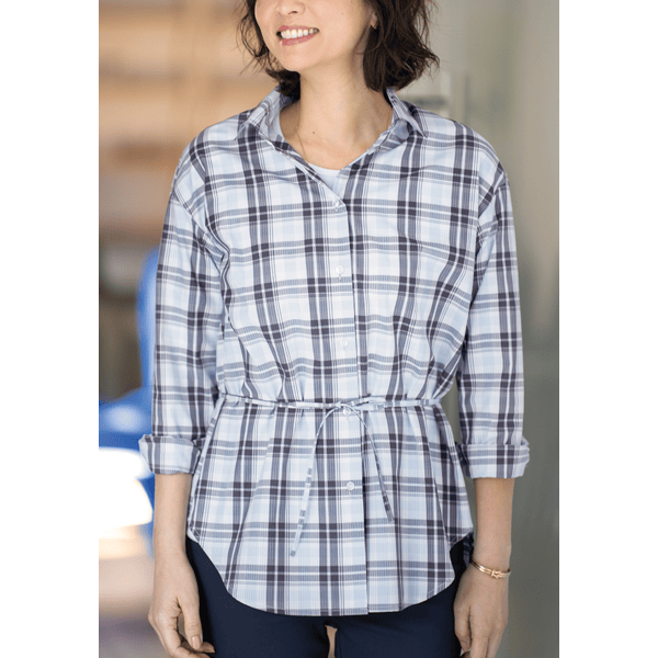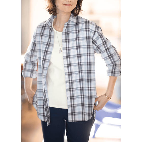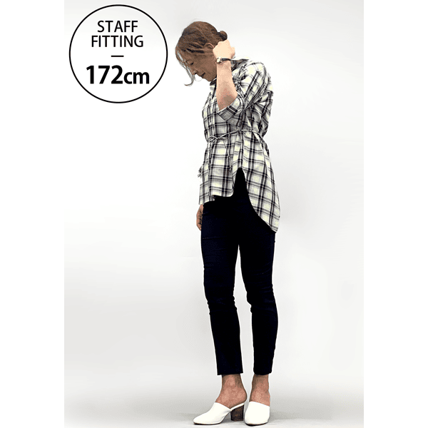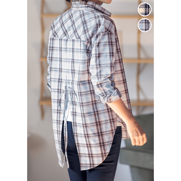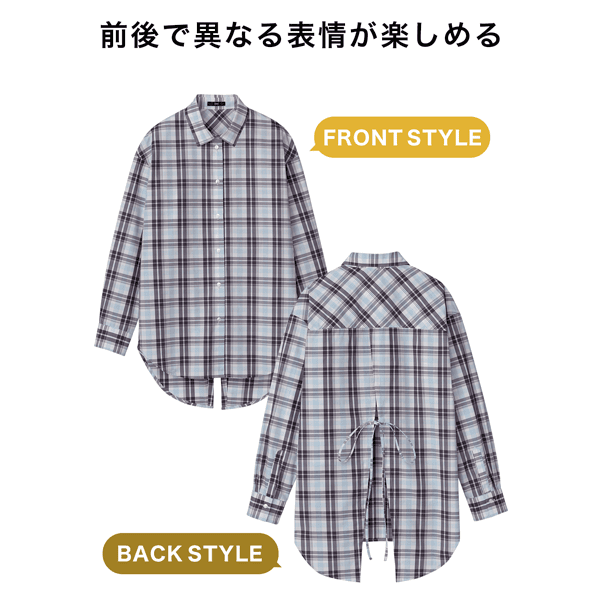 さっと羽織ってサマになりやすいロング丈のチェックシャツ。後ろ丈が長めでヒップをふんわりカバーします。リボンの結び方次第で、表情が変わり着回しも自在に。後ろの深いスリットが、脚長効果を引き出します。