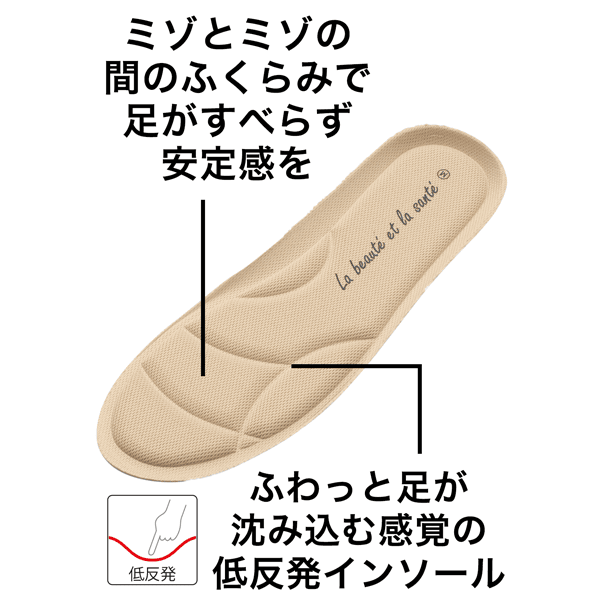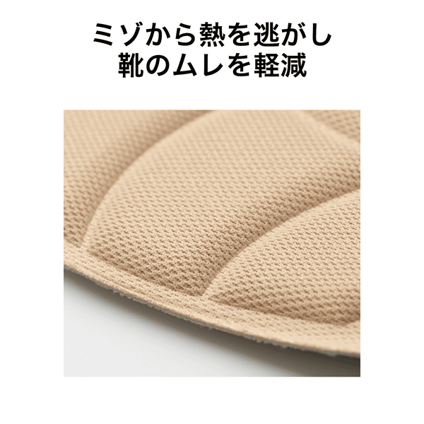足裏の熱を逃がしやすくするミゾも快適さをプラスしています。お手持ちのフラットシューズや、パンプスなどで今まで履きずらかった靴にお試しください。