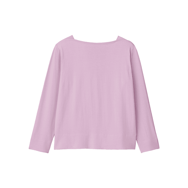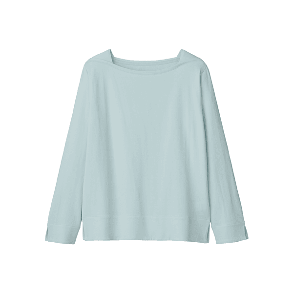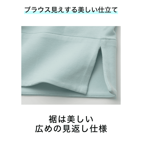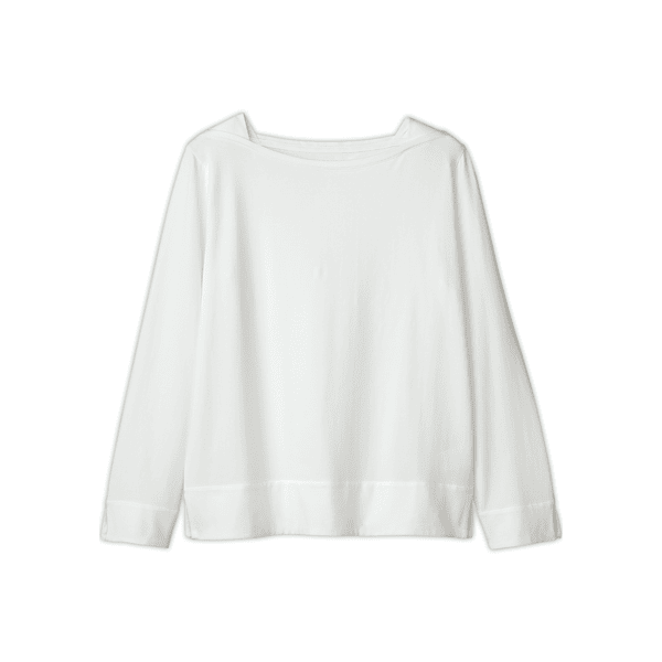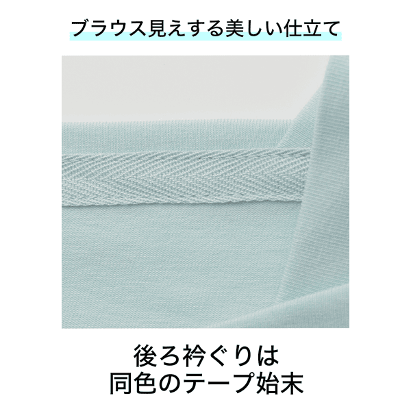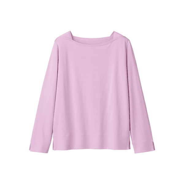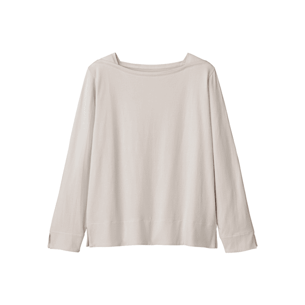 プラチナナノコロイドを配合した保湿、防臭機能のあるカットソー。品のあるマチ付きのボートネックで顔まわりをシャープに見せます。身体のラインをひろいにくいです。