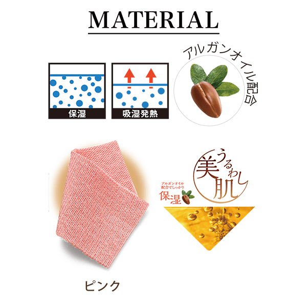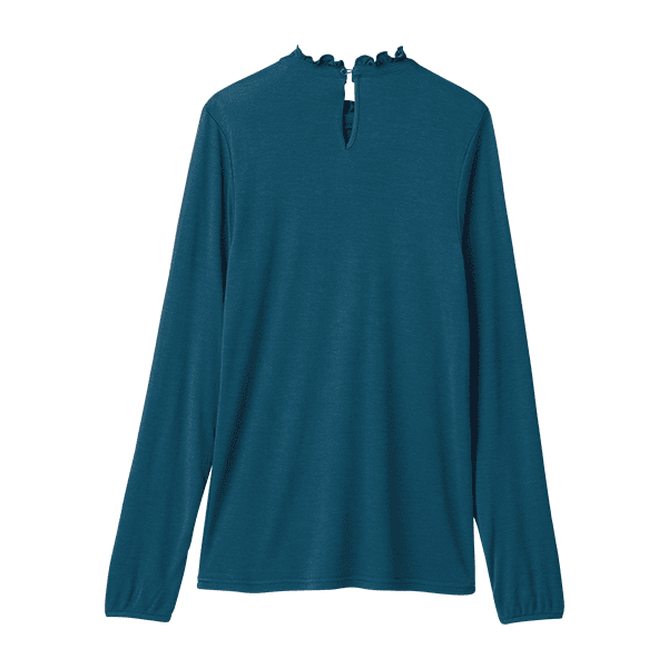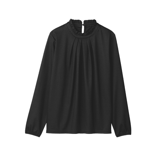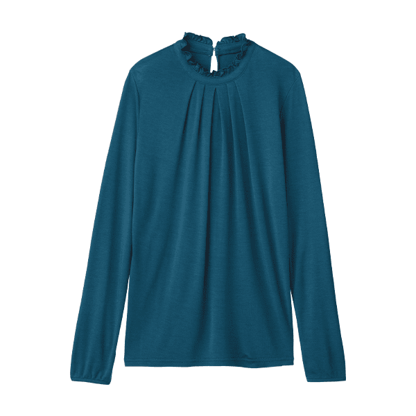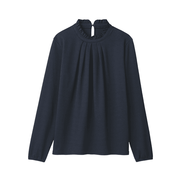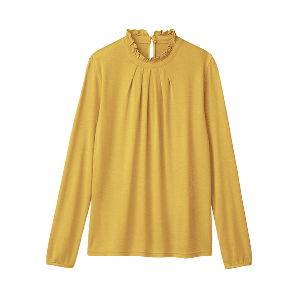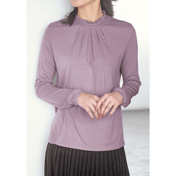 フリルネックが華やかな印象の、アルガンオイル配合のデザインカットソー。ブラウス見えするので1枚で着てもおしゃれさんに。保湿機能付きであたたかく、肌を乾燥から守ります。