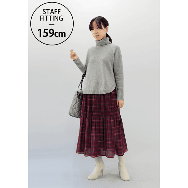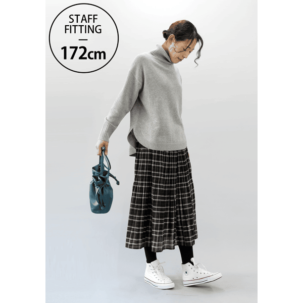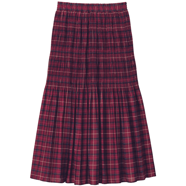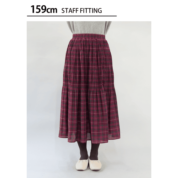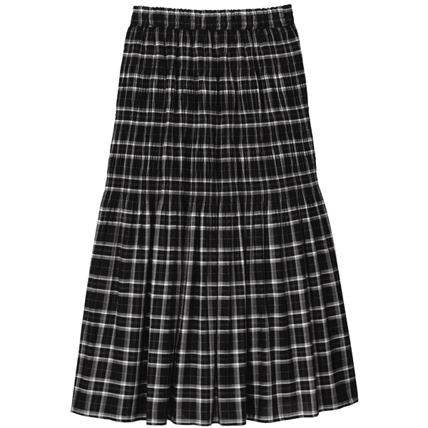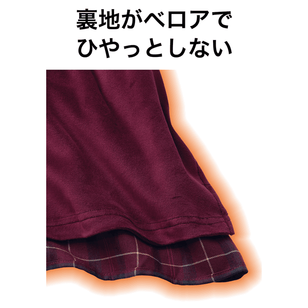 ヒダ部分に変化をつけ伸縮性を出した、マジョリカプリーツスカート。大人っぽいチェック柄がコーデの主役になります。腰まわりがすっきり見え、ベロアは薄手のもので、着ぶくれすることなく安心して着られます。