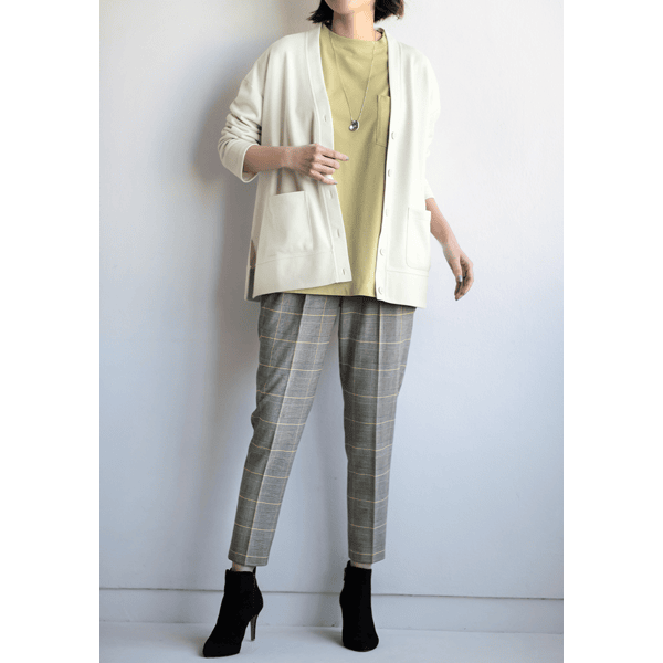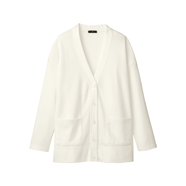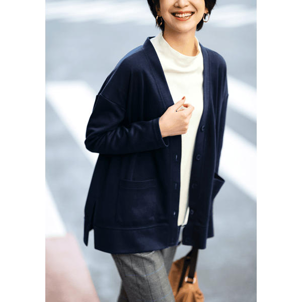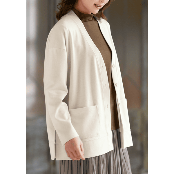 やわらかで厚みがありUVカットができるカットソーカーディガン。ボックスシルエットで、重ね着もしやすいです。ヒップが隠れる長め丈で体型カバーもできます。
