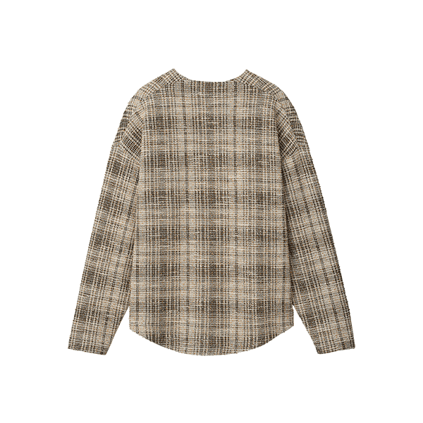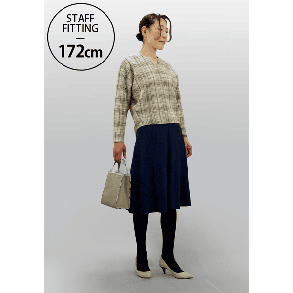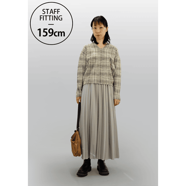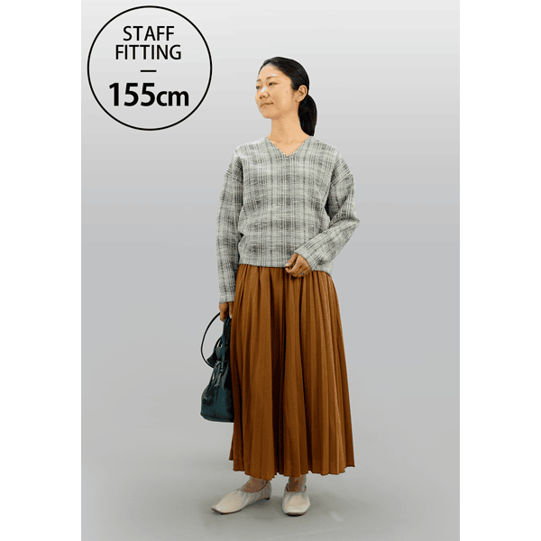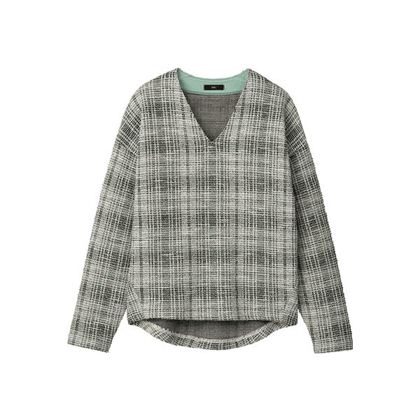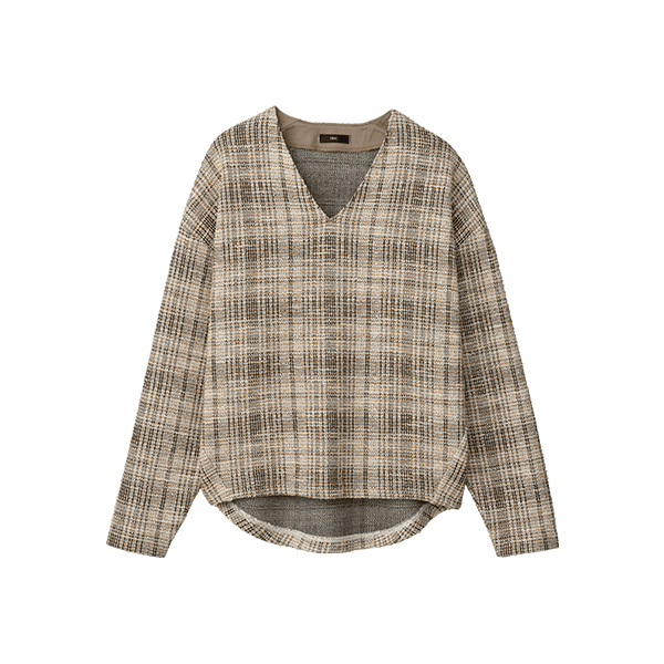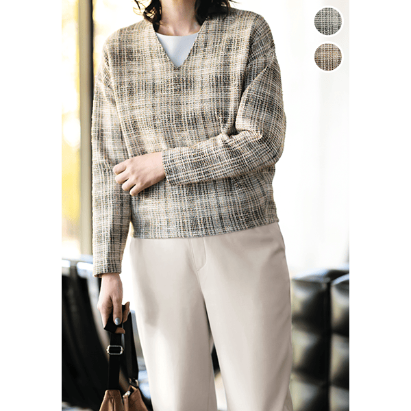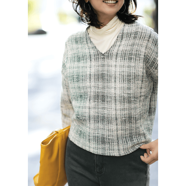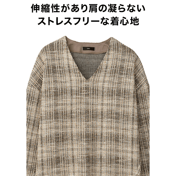 ツイード見えするのにジャージーでラクチンな着映えるプルオーバーです。ハリのある生地が立体的なフォルムを作り、肉感をカバー。Vネックと裾絞りのシルエットでゆとりのあるサイズ感でもすっきり見えます。キレイめな着こなしはもちろん、カジュアルコーデに合わせやすく普段使いしやすいデザインに。