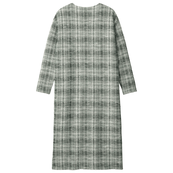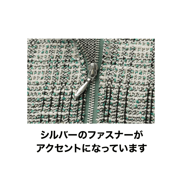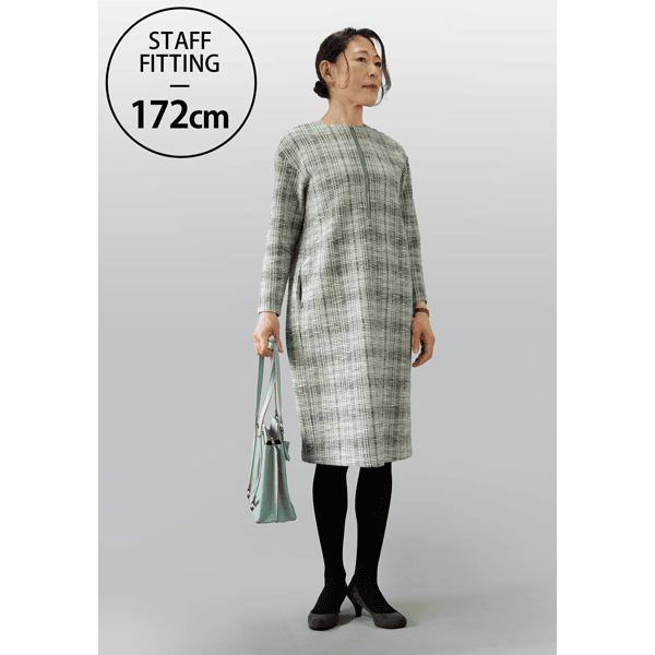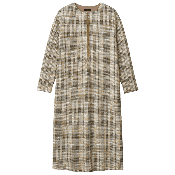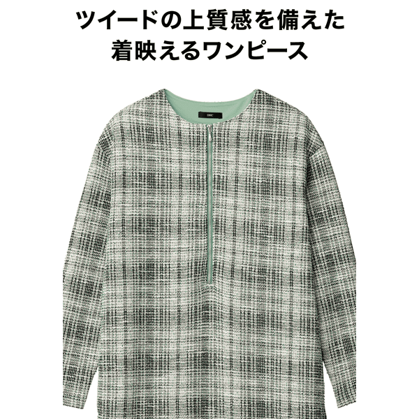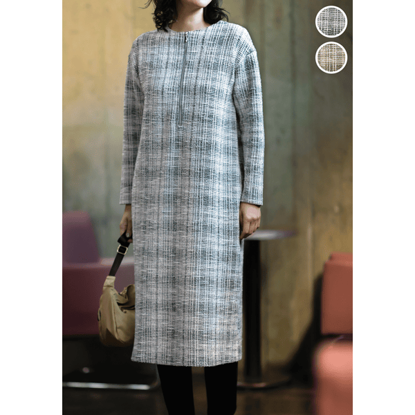 ツイード見えするのにジャージーでラクチンな着映えるワンピースです。伸縮性があり、肩の凝らないストレスフリーな着心地。シルバーのファスナーがアクセントになった、オンオフで着られるシンプルなデザインです。