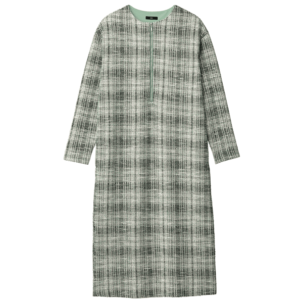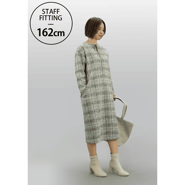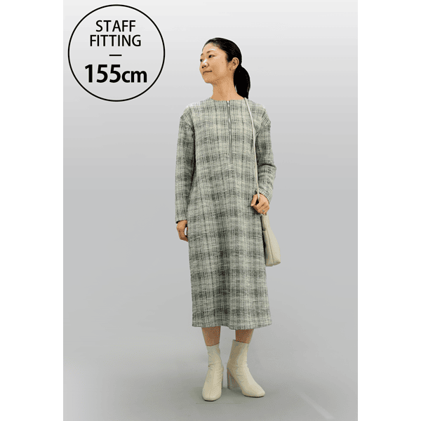 【スタッフコメント】きれいめなジャージーのツイード生地を使用したオーバーサイズのワンピースです。ファスナーを開けると顔まわりがすっきり見えて、カジュアルさもアップします。しっかりめの生地感も相まって、身体が泳ぐようなゆったりとした着心地です。