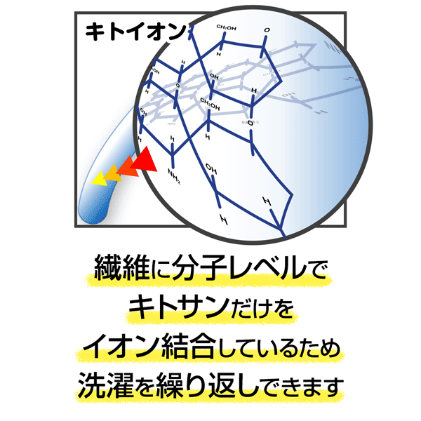 カニやエビの甲羅からとれる、優れた抗菌作用のあるキトサンを分子レベルでイオン結合させた技術で作られた「キト抗菌」のおしゃれ服。洗濯を繰り返しても、抗菌防臭効果をずっとキープします。さらに100%天然由来で、お肌にもやさしいです。