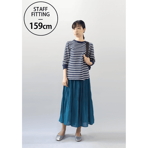 肩幅がしっかりあるのでMかLでサイズ選びに悩みました。肩幅と口コミを見てLサイズにしました。上質なコットンで洗濯しても形が崩れませんし、肩にギャザーがある事でカジュアル過ぎず、首のあきもちょうど良く、一枚で着る事ができます
