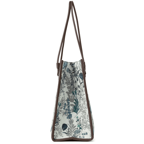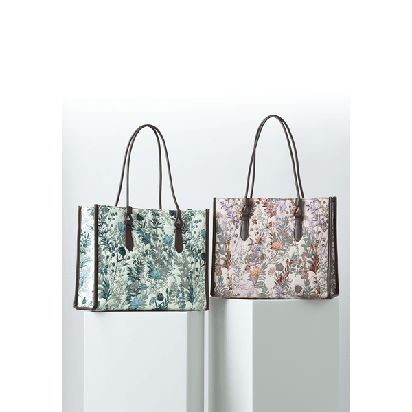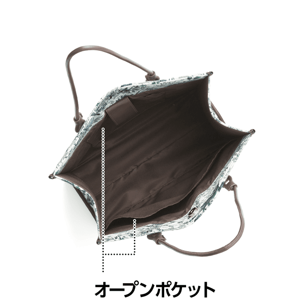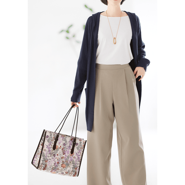 大きめのサイズ感で出し入れがラクなジャカードトート。しっかりハリがあり、自立するのに軽~い仕上がりです。持ち手、つけ根、サイドのパイピングは合皮使いで高級感があり、高見えします。