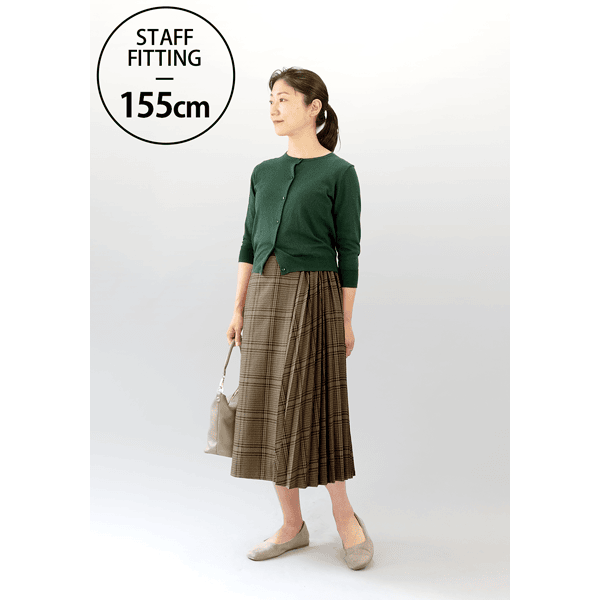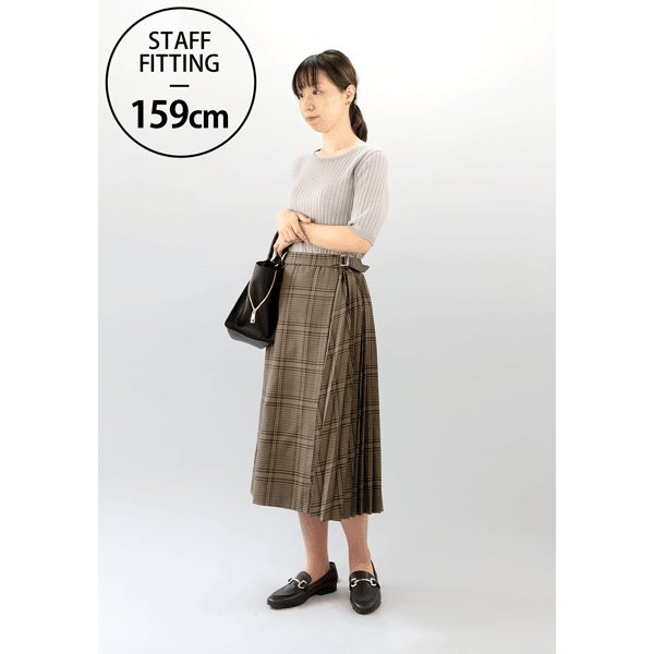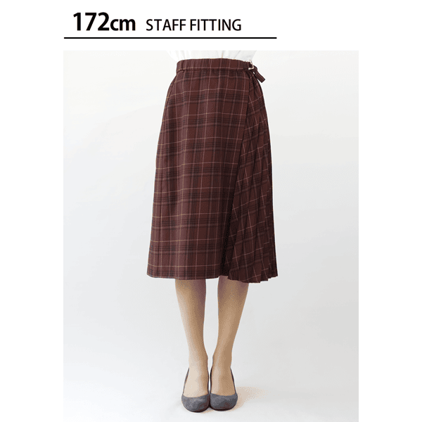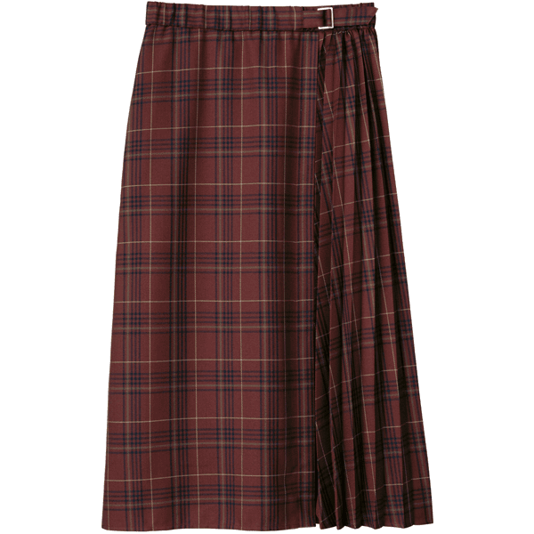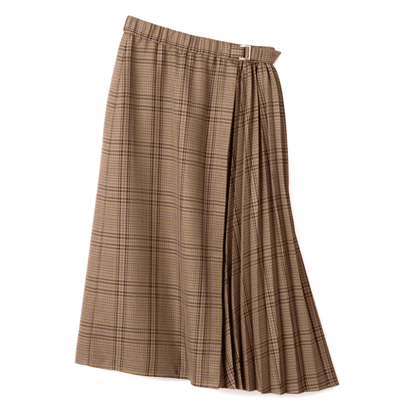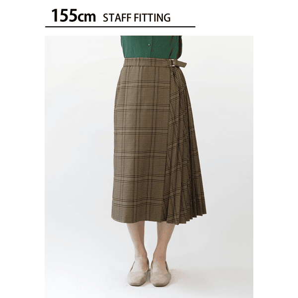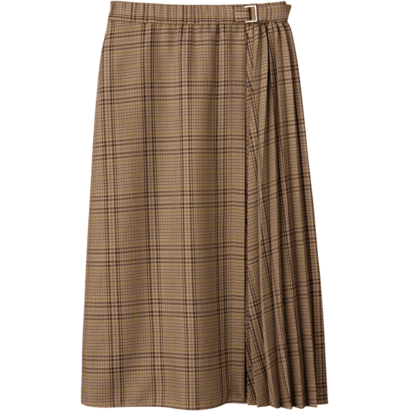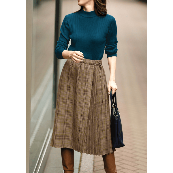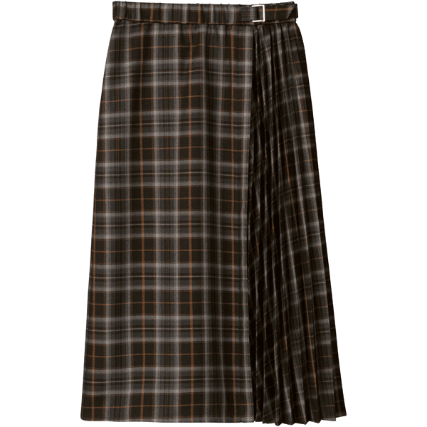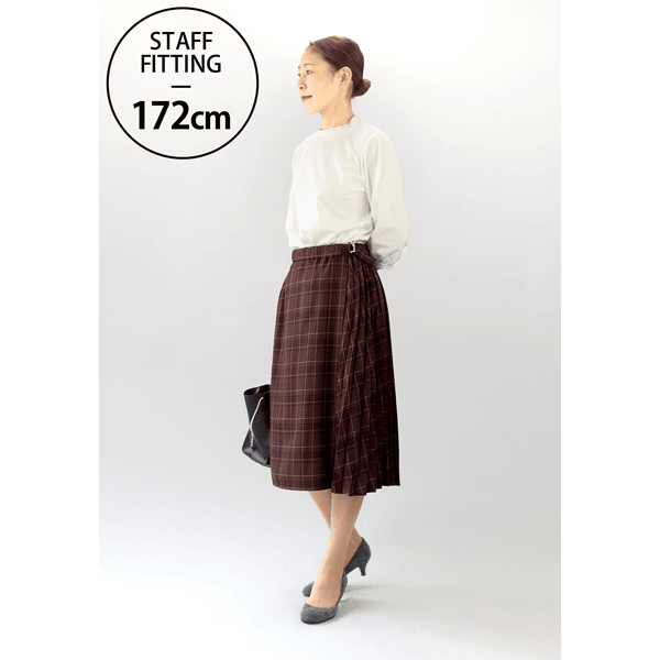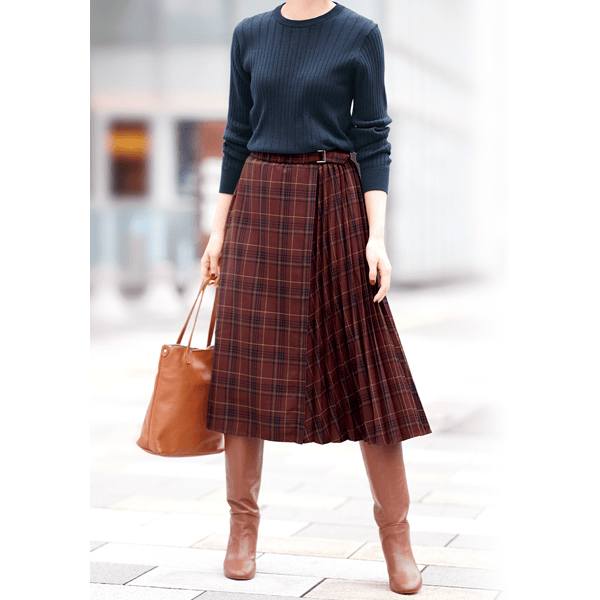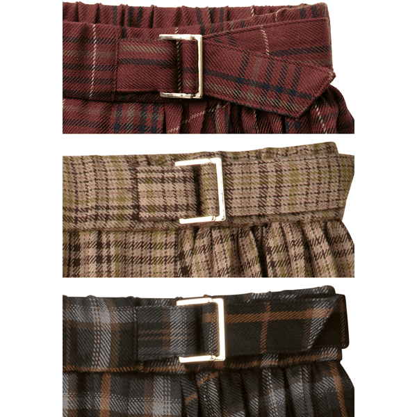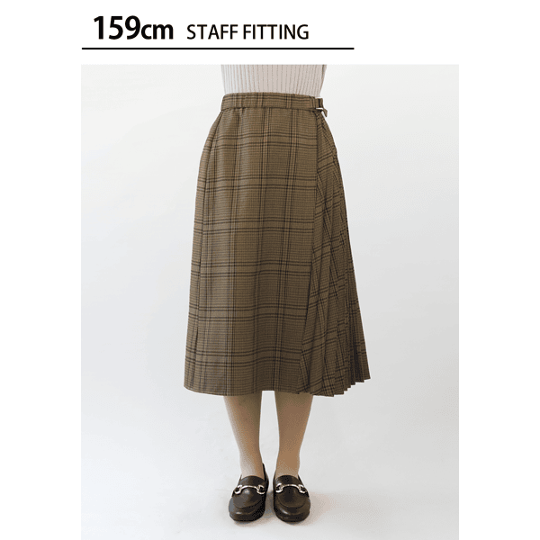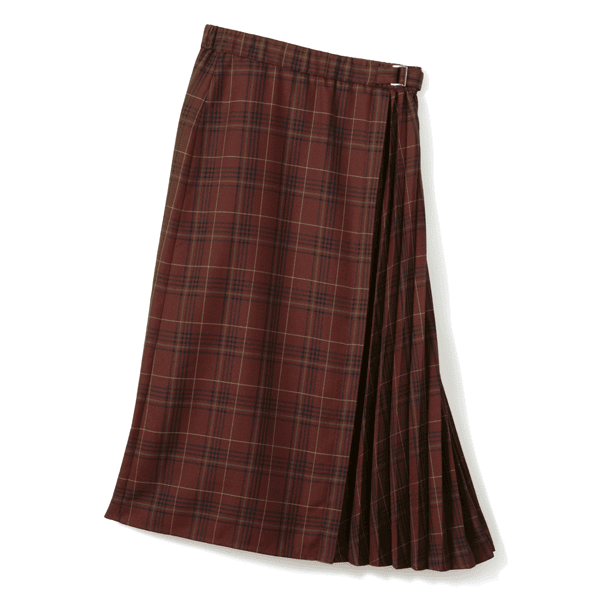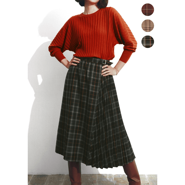 秋らしいシックなチェック柄のサイドプリーツスカート。軽やかな印象のひざ下丈でロングブーツとの相性がいいです。左脇のベルトディテールはタックインしたときのアクセントに。
