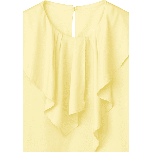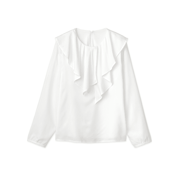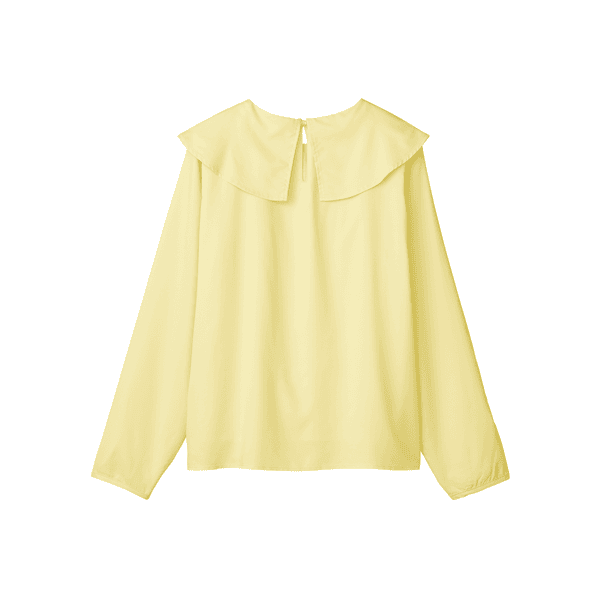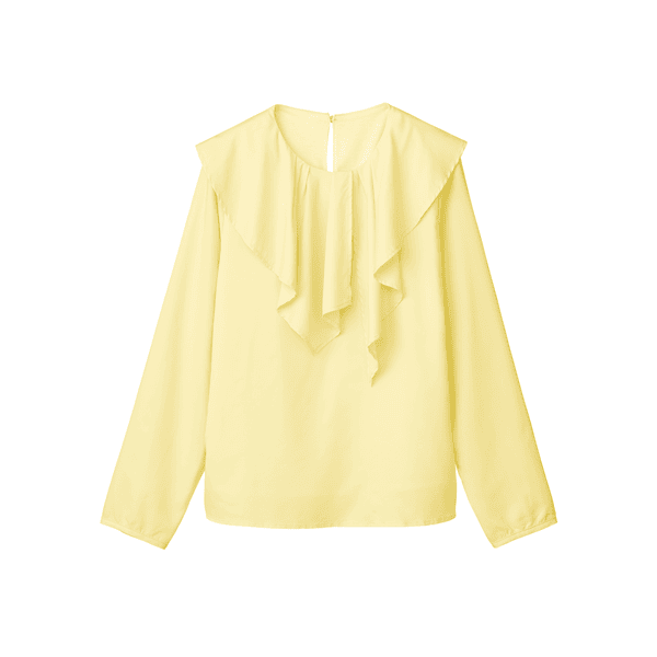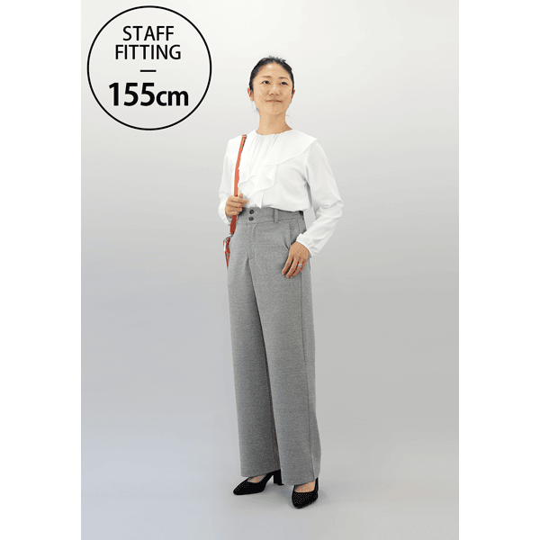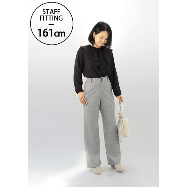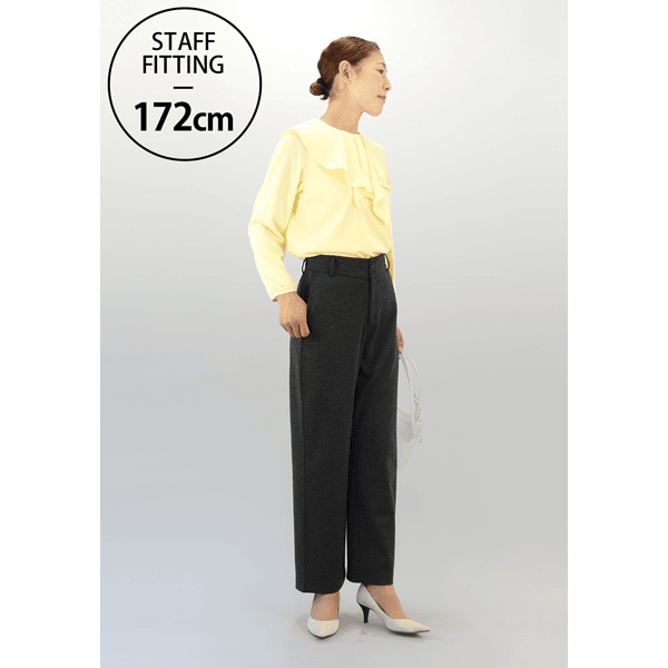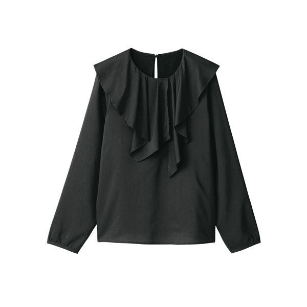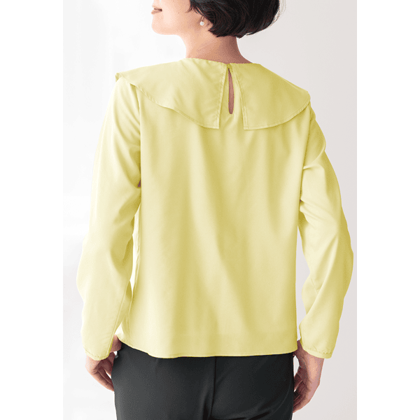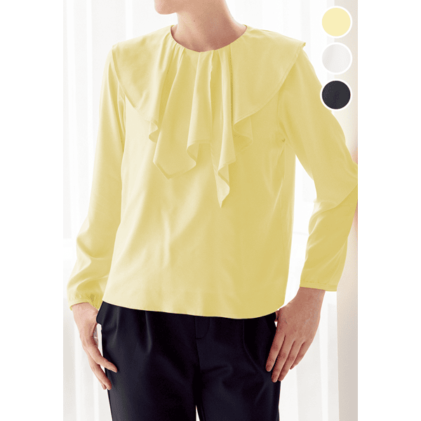微起毛をかけたカットソー裏地で肌ざわりがよく、下着の透けが気になりにくいキレイめブラウス。アシンメトリーなラッフルカラーで顔まわりが華やぎます。