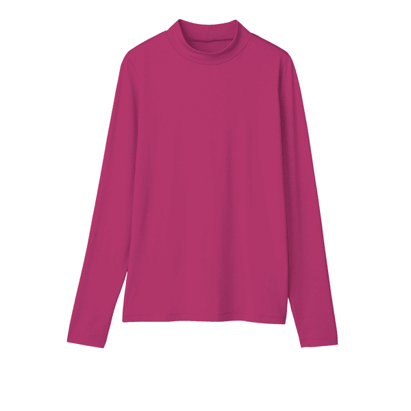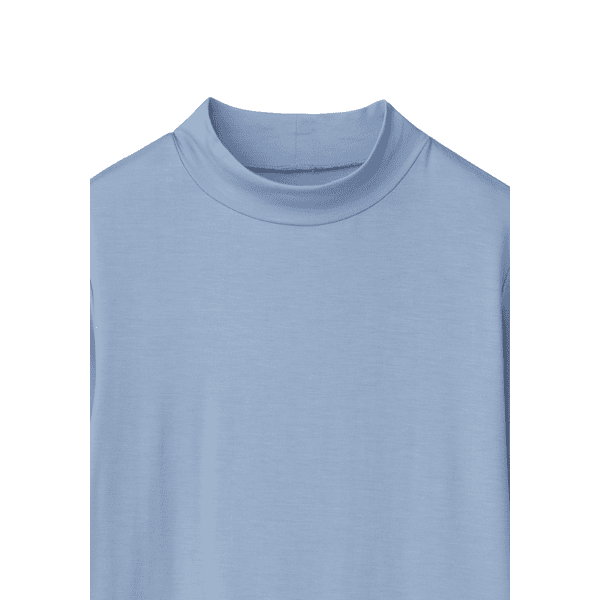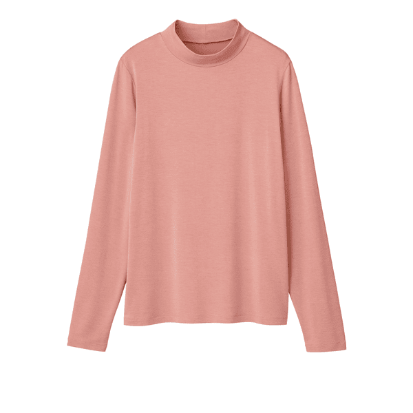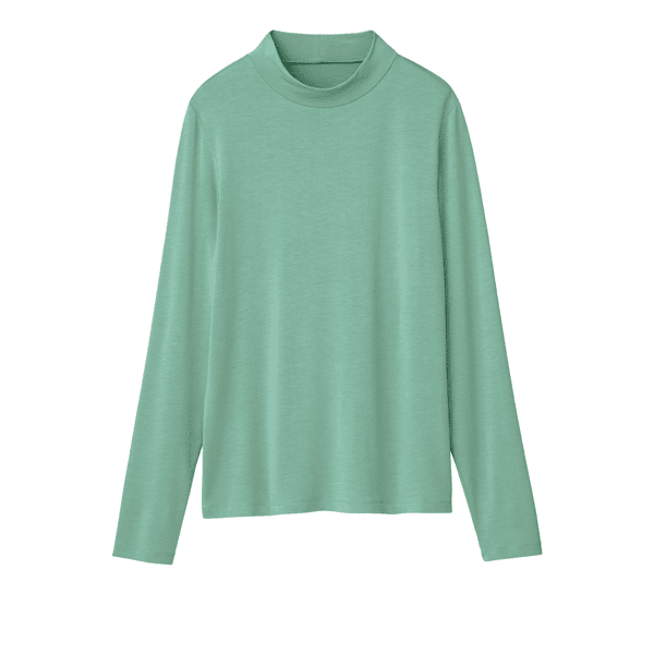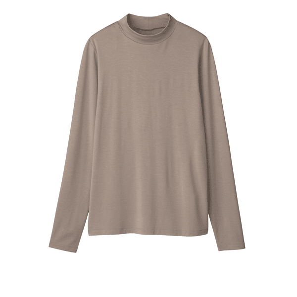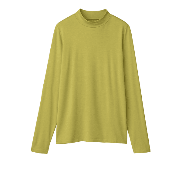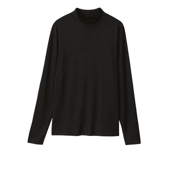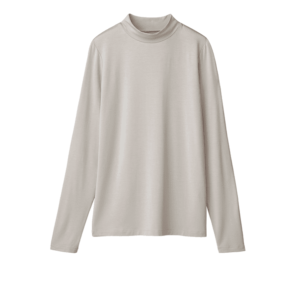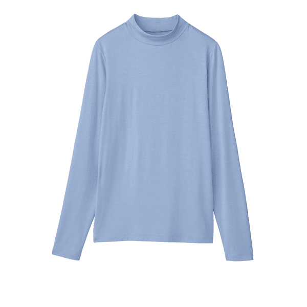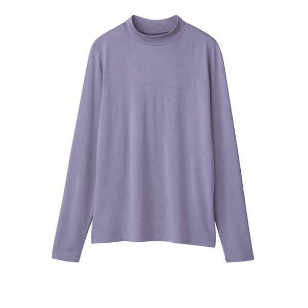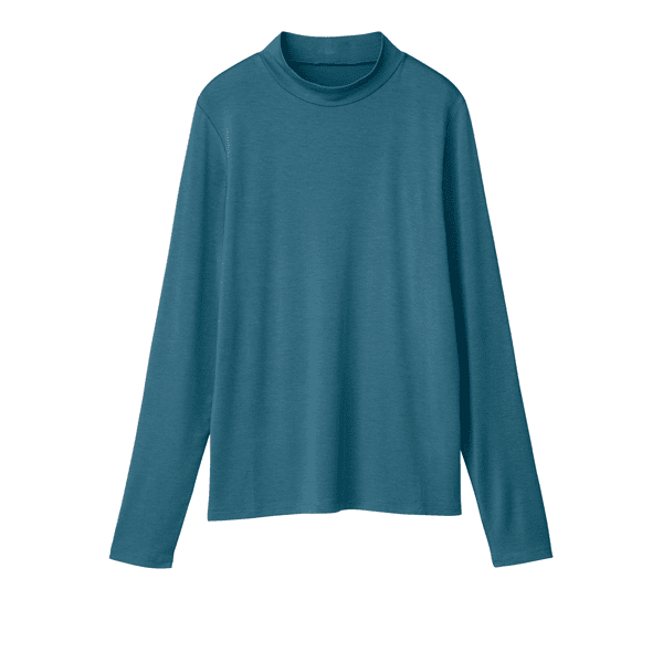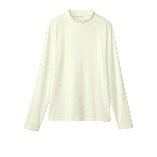 保湿効果で肌の乾燥を防ぐ、レイヤードスタイルに欠かせないベーシックなカットソー。とても着心地よく、小顔見えするハイネックをご用意しました。