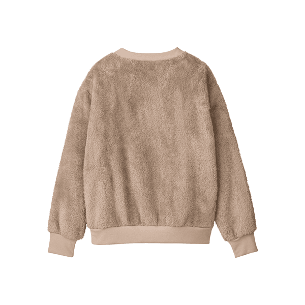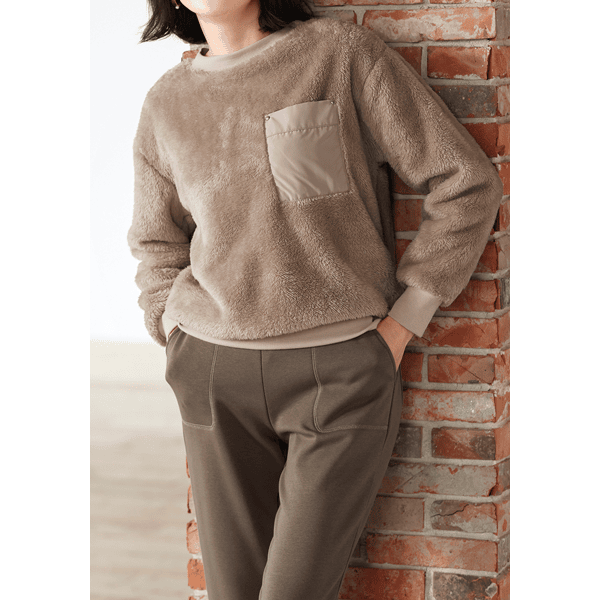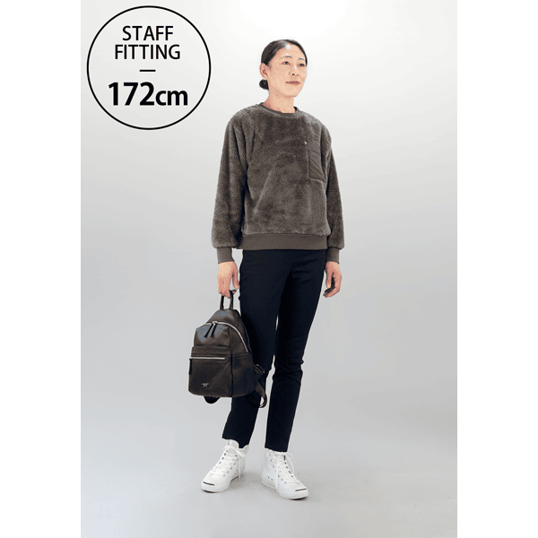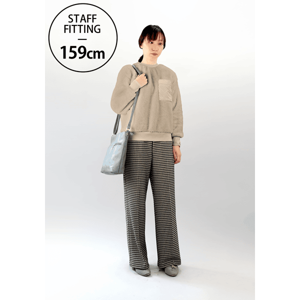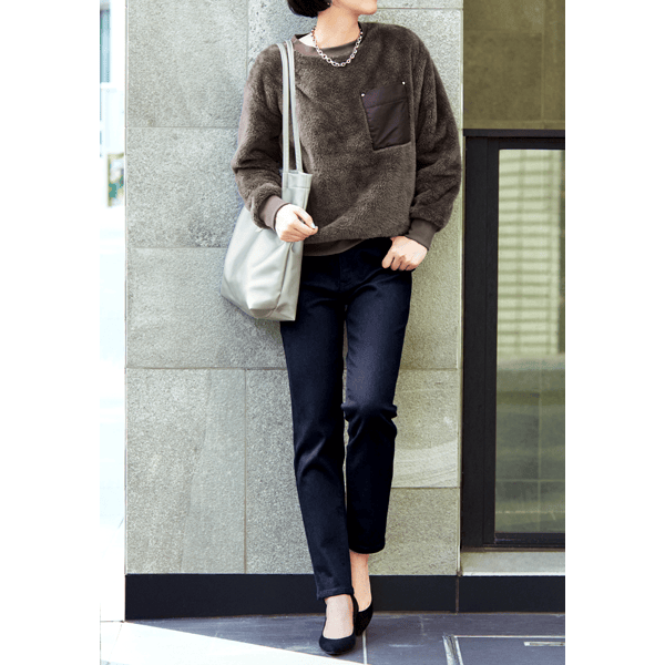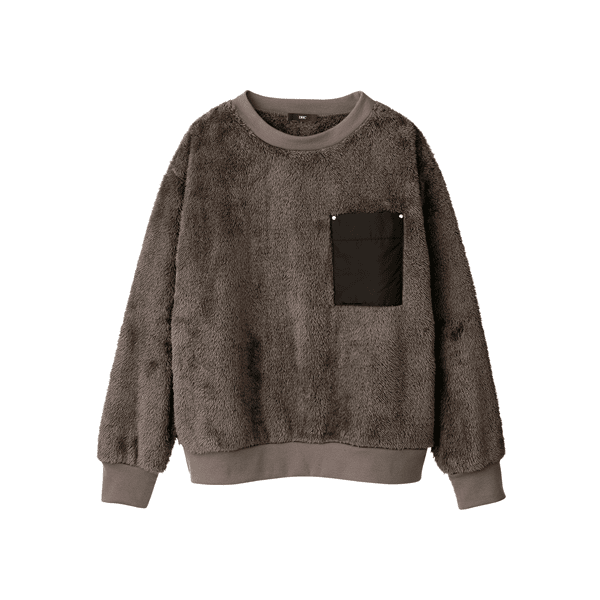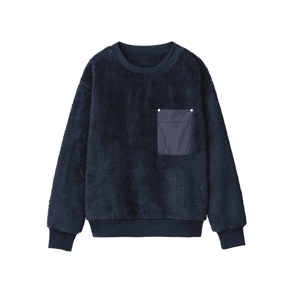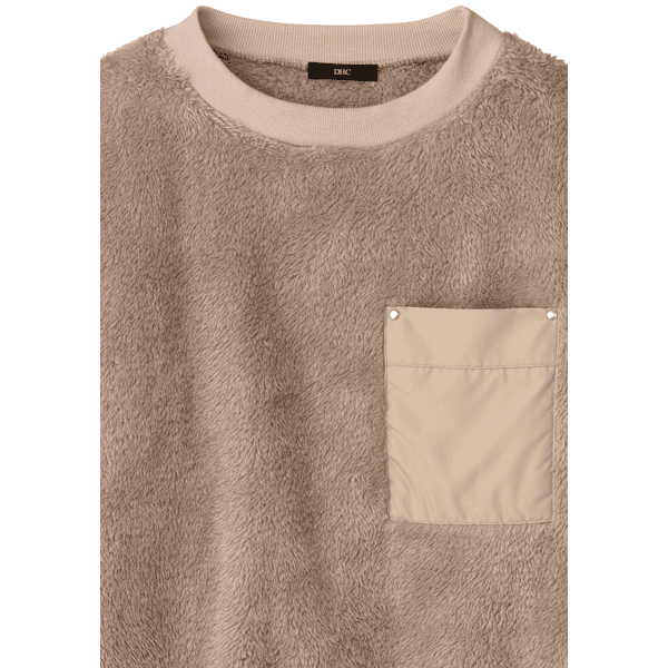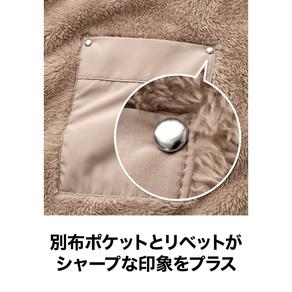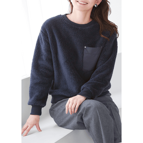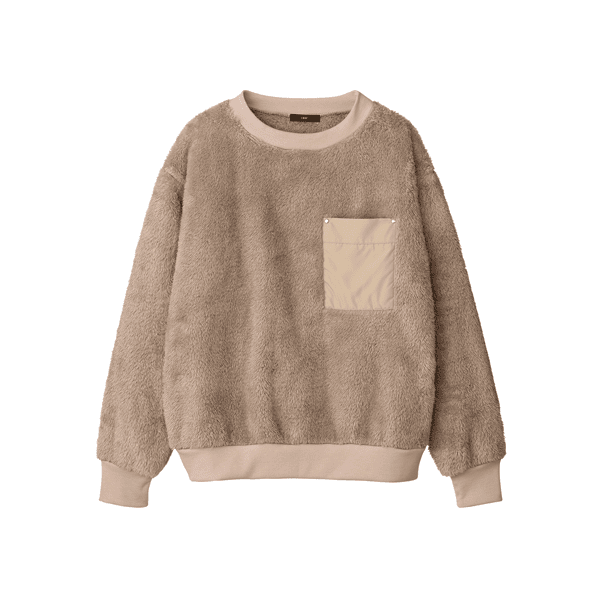 ふわふわの両面シャギーが空気を含み、軽くあたたかな着心地のプルオーバー。チクチク感がなくやさしい肌ざわりで心地よいです。別布のポケットとリベットがシャープな印象をプラスします。