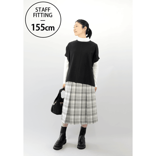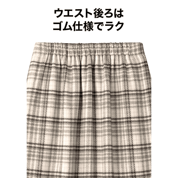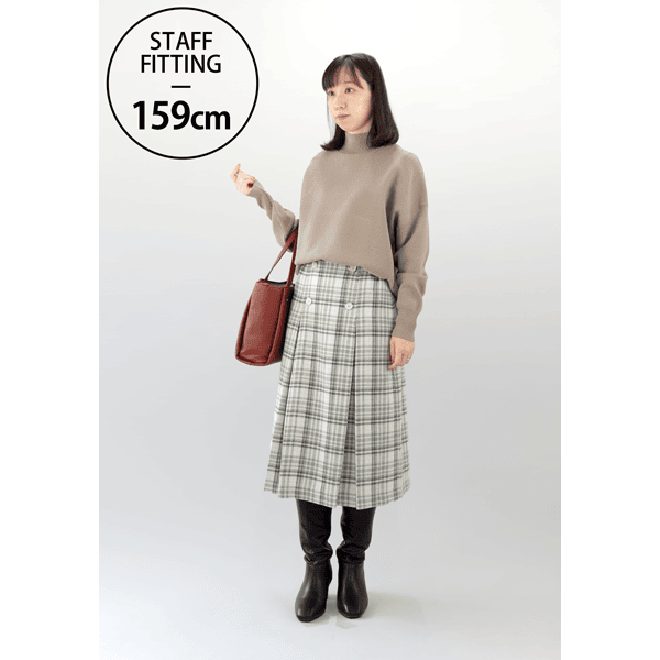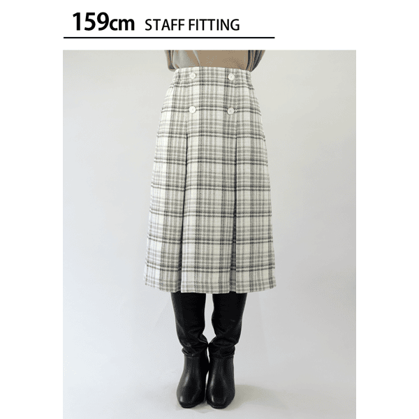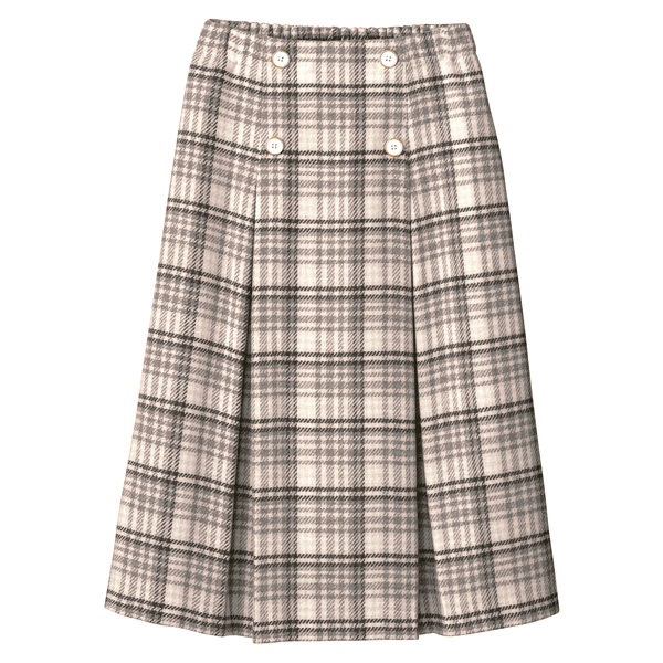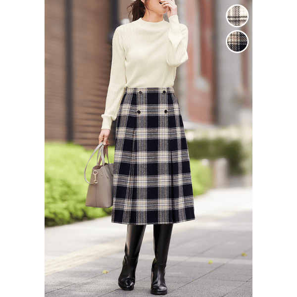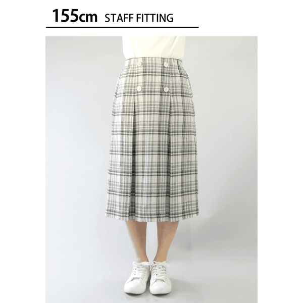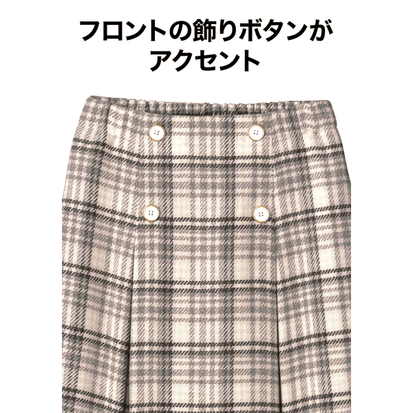 コーディネートの主役になる、インパクトのあるビッグチェック柄スカートです。きちんと感があり、すっきりとはける広がりすぎないボックスプリーツデザインで、フロントの飾りボタンがアクセントになり、タックインした時もお腹が目立ちにくくなっています。重くなり過ぎずコーディネートしやすい膝下丈です。
