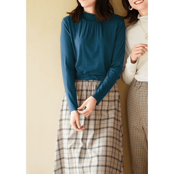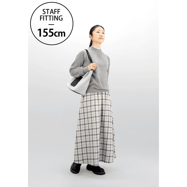 前後中心部分にのみギャザーを入れることで、お腹やヒップはカバーしつつ、腰まわりが横に広がらず、着やせして見えるスカート。裏フリースは伸縮性があるので動きやすいです。
