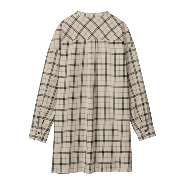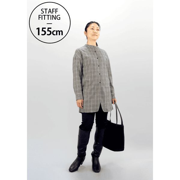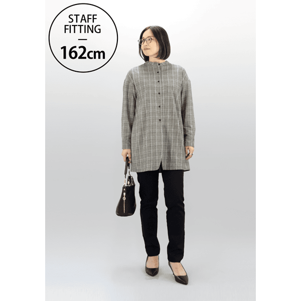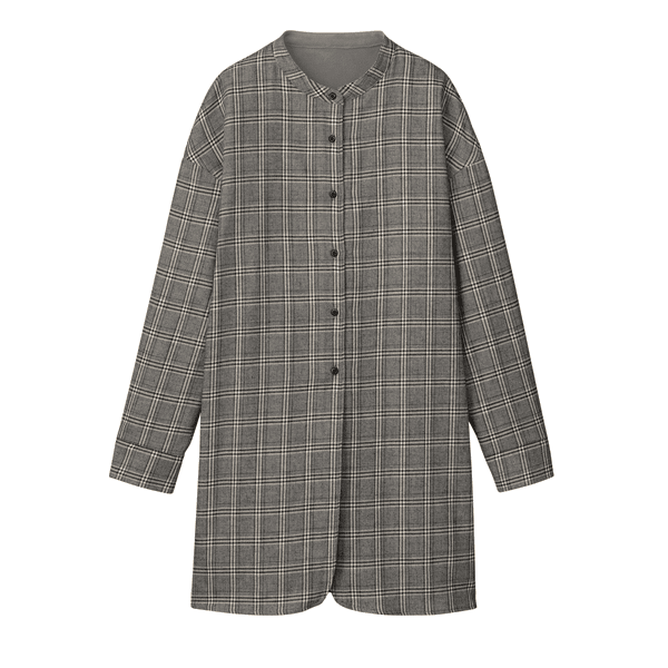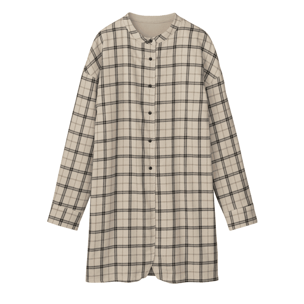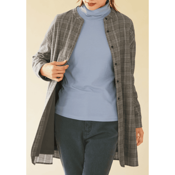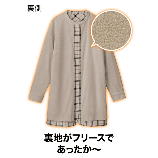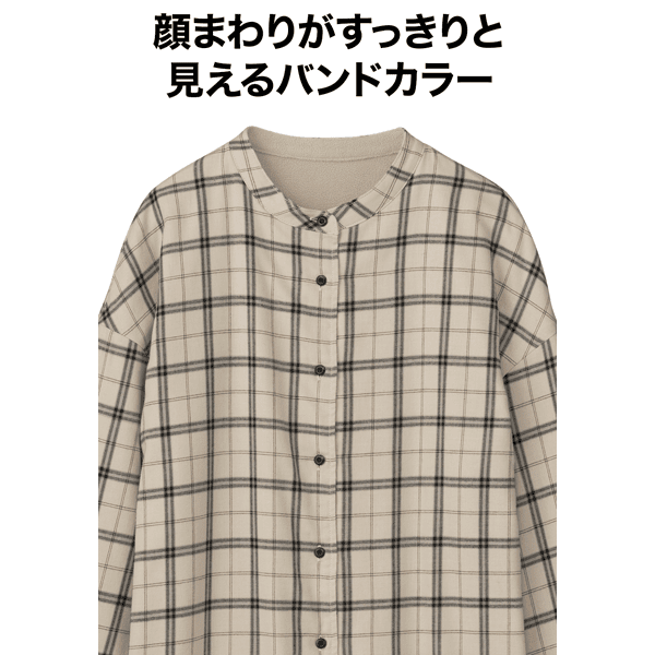 厚すぎないフリース裏地であたたかく、着ぶくれせずにすっきりと着られるロングシャツ。ヒップが隠れる丈で体型カバー、高め位置のボタン、バンドカラーがスタイルよく見せます。