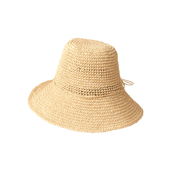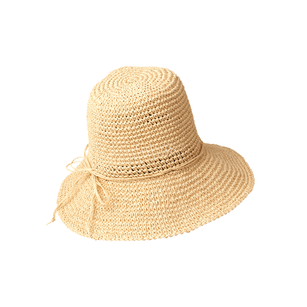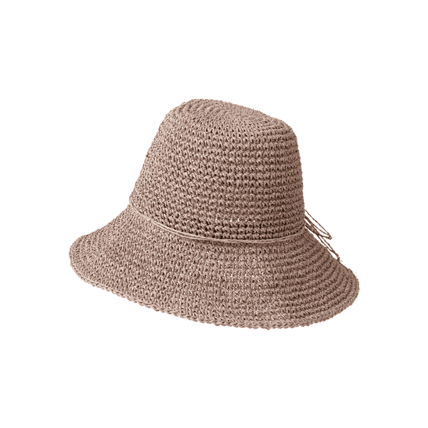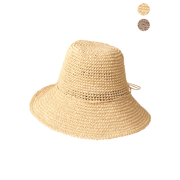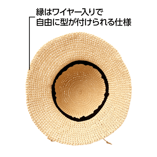 軽くて通気性抜群なペーパー素材を細編みで仕上げた、夏のコーデに合わせやすいナチュラルカラー展開のペーパーハットです。ツバ縁はワイヤー入りでお好みの形状にでき、サイドにはあごヒモを付けられるループ付き。(※あごヒモは付属していません)