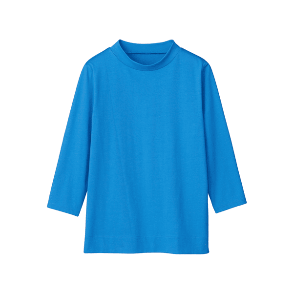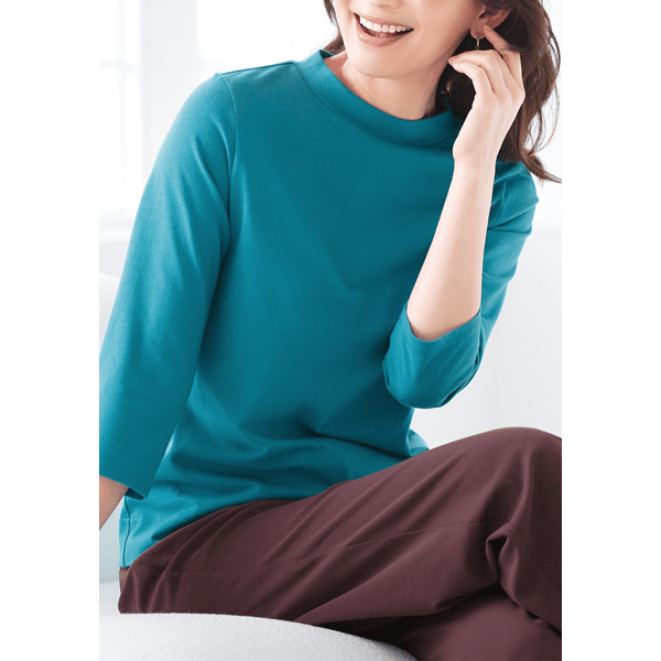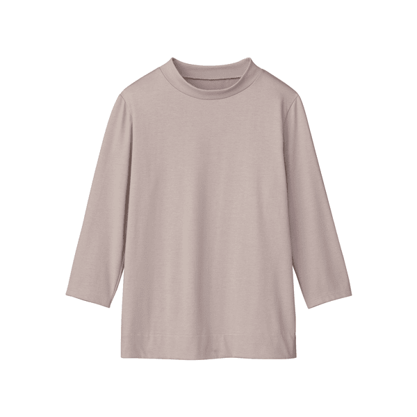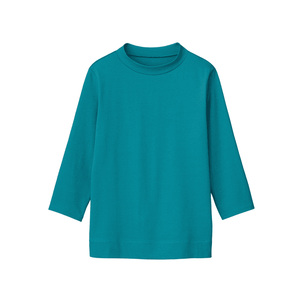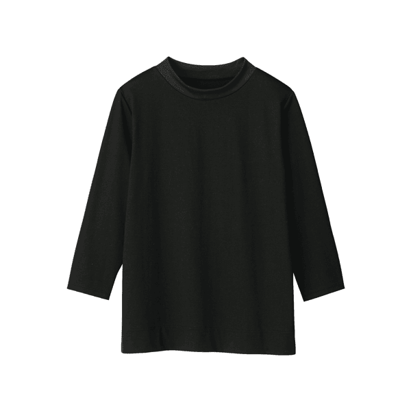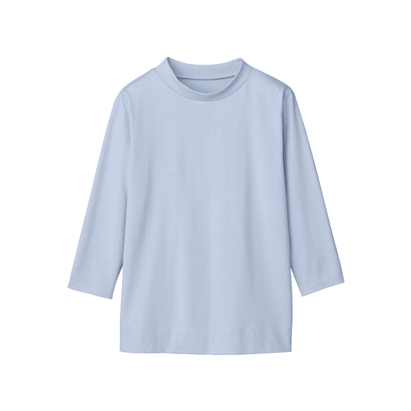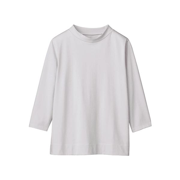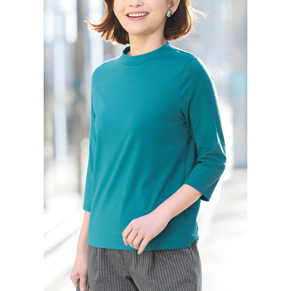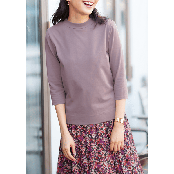 衣服内のムレ具合により通気性を自然にコントロールするいつも快適な7分袖カットソー。ほどよいハイネックに、身体のラインが出にくいサイズ感ですっきりと着られます。