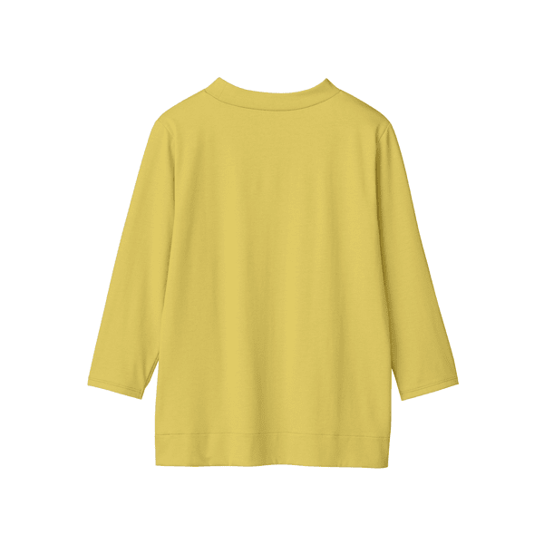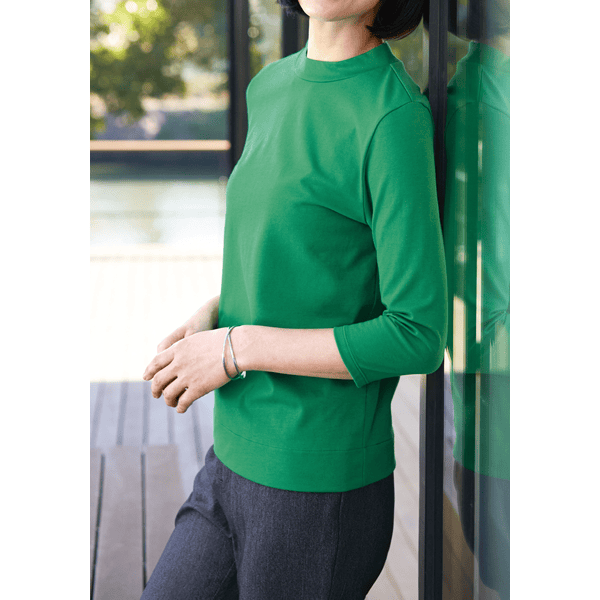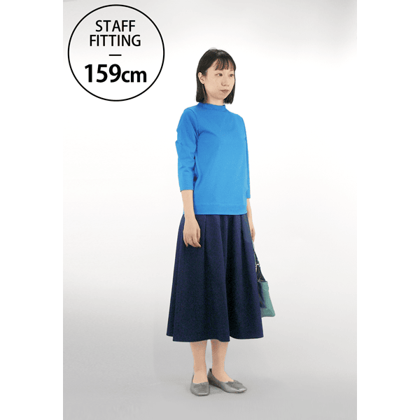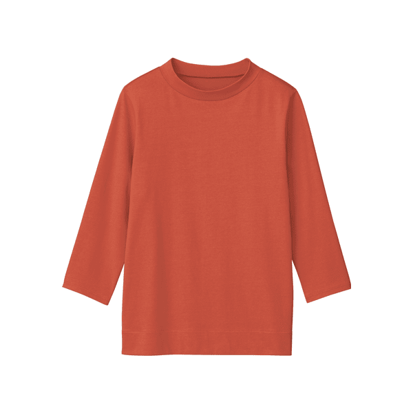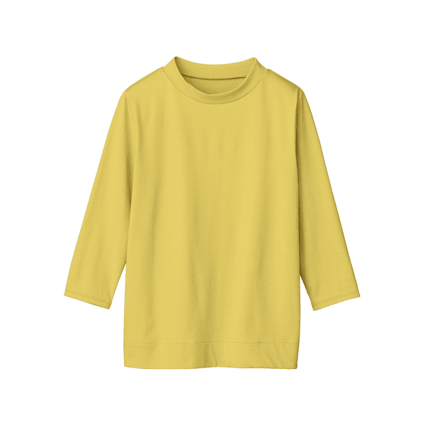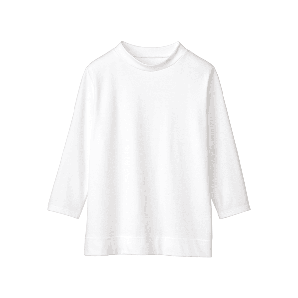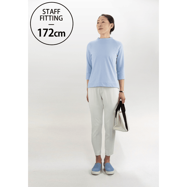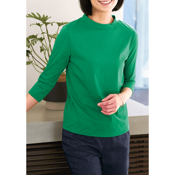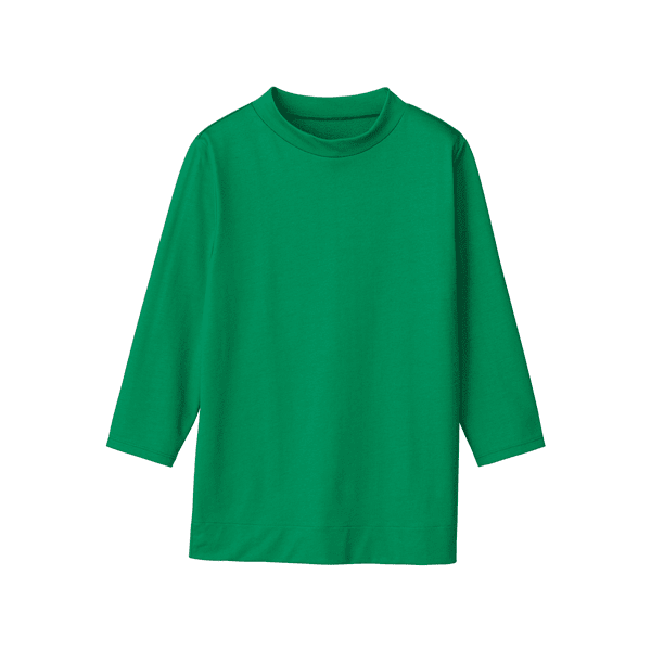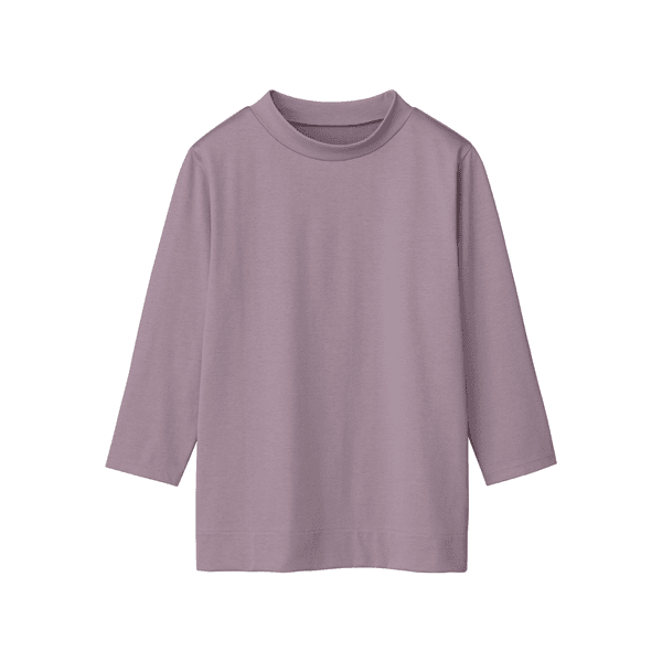 衣服内のムレ具合により通気性を自然にコントロールするいつも快適な7分袖カットソー。ほどよいハイネックに、身体のラインが出にくいサイズ感ですっきりと着られます。