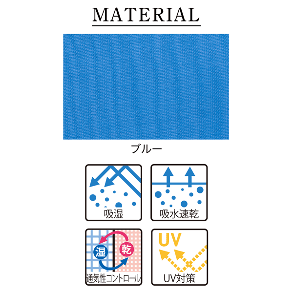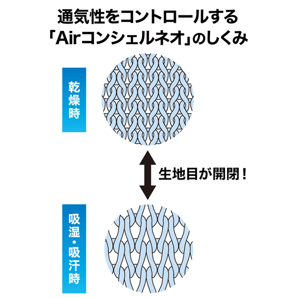 汗や湿度の状態によって通気性をコントロールする「エアジーヌ™」を高混率で使用した生地。くり返し洗濯しても吸湿・吸水速乾機能を保ちます。