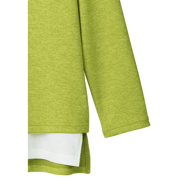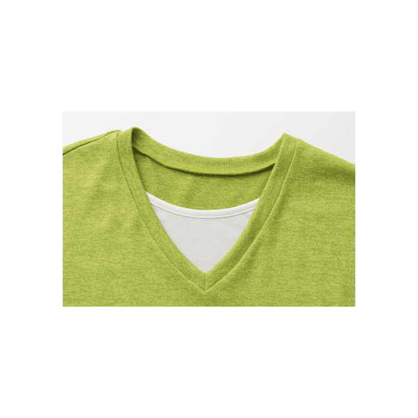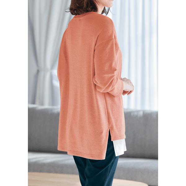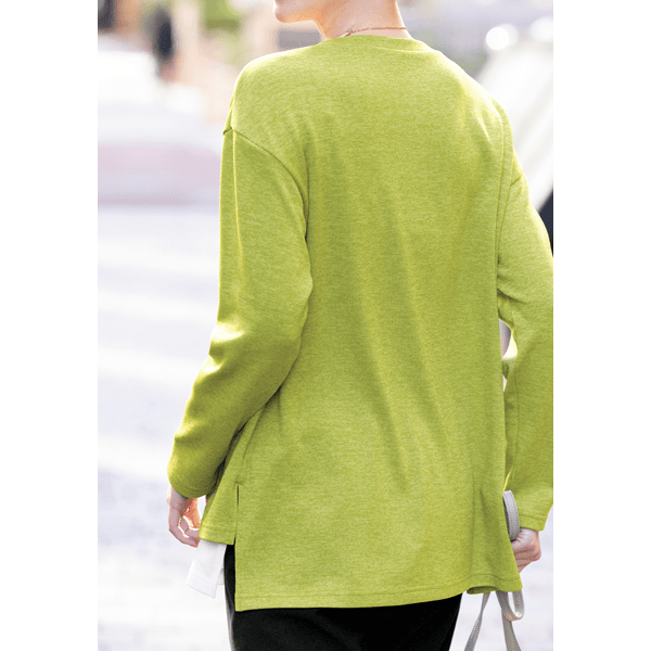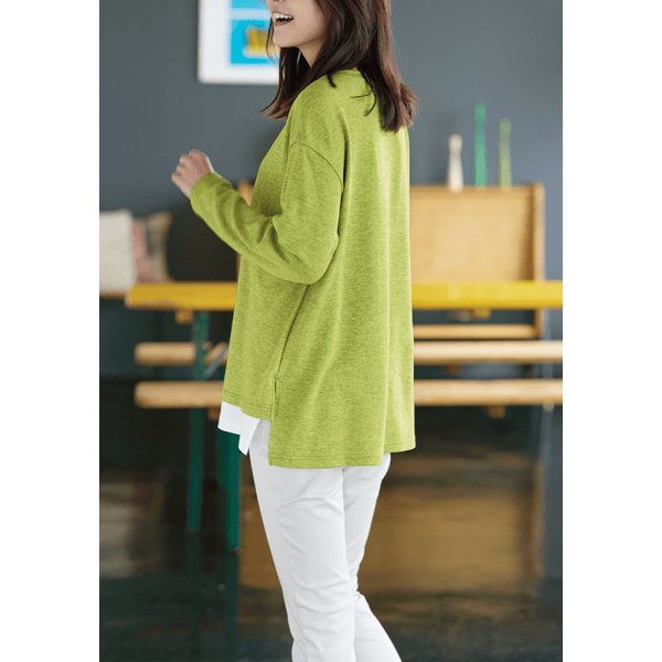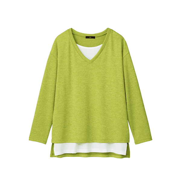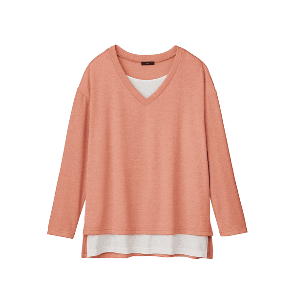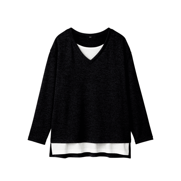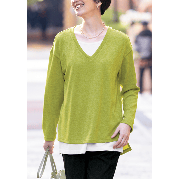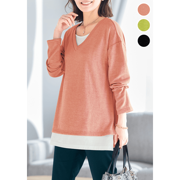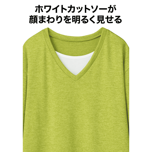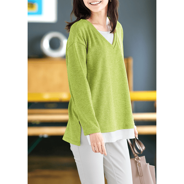 白のカットソーとVあきトップスを重ねたようなデザインで、コーディネートの手間なくおしゃれ見えするカットソー。身頃にほどよくゆとりがあり、ヒップまで隠れる身丈が上品です。