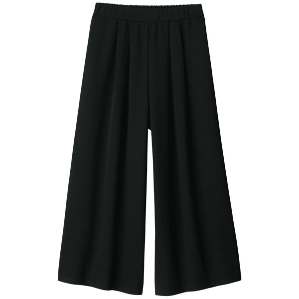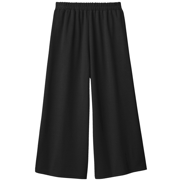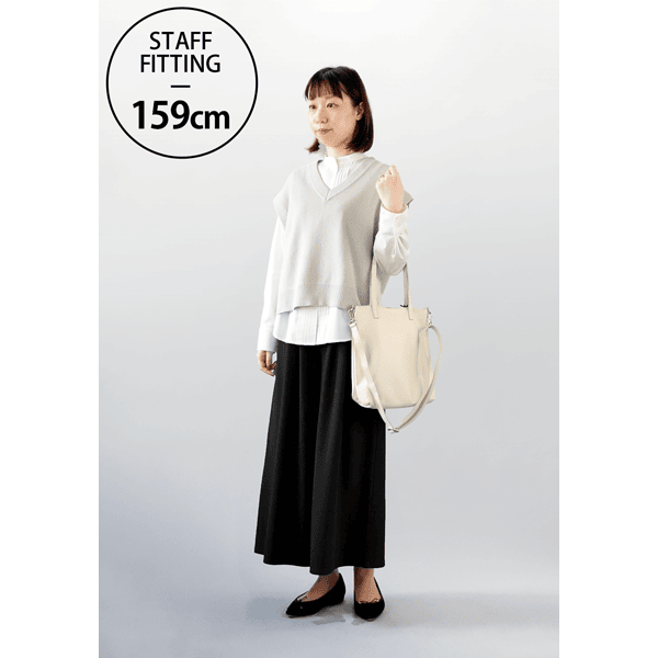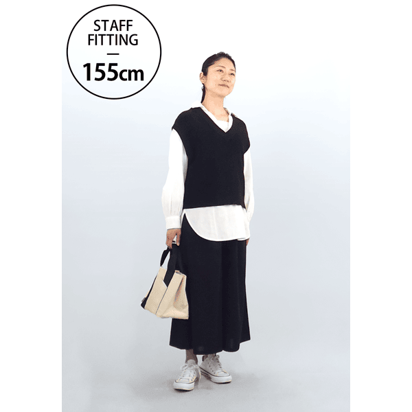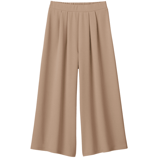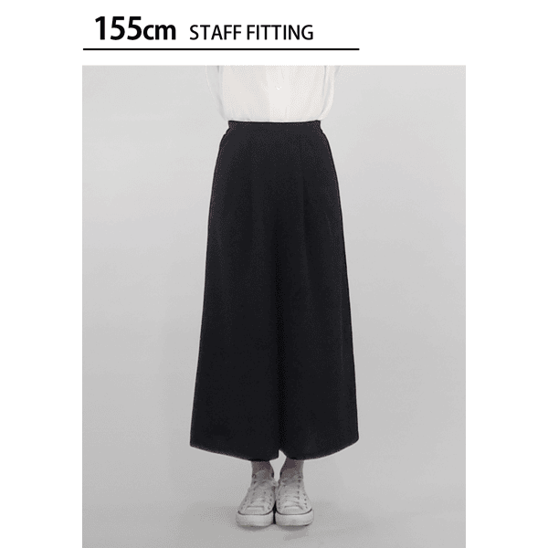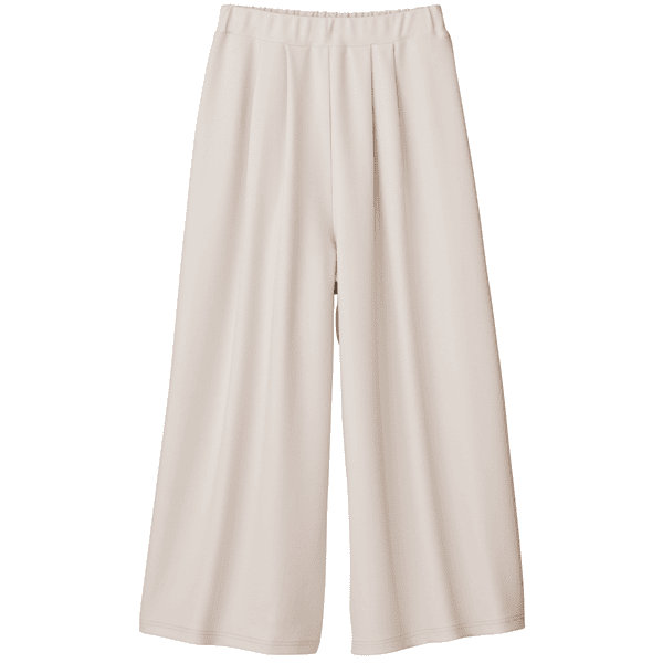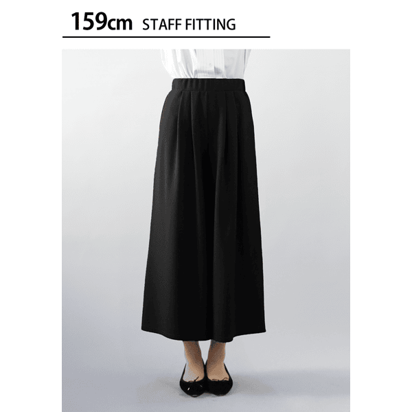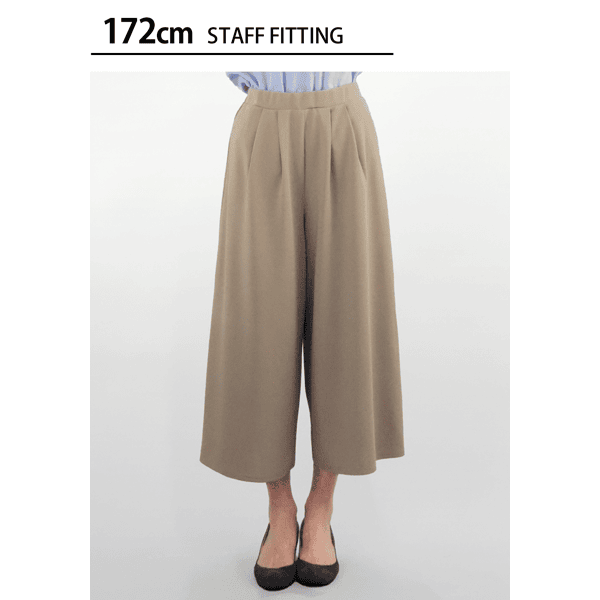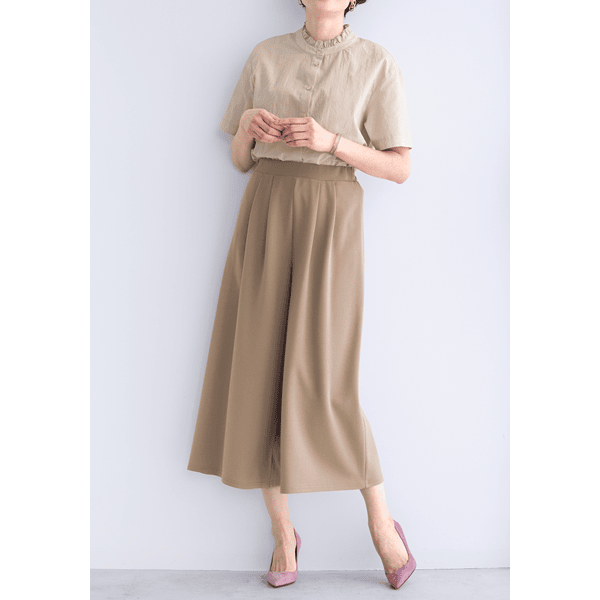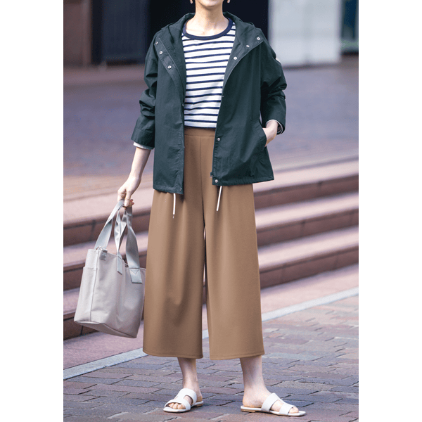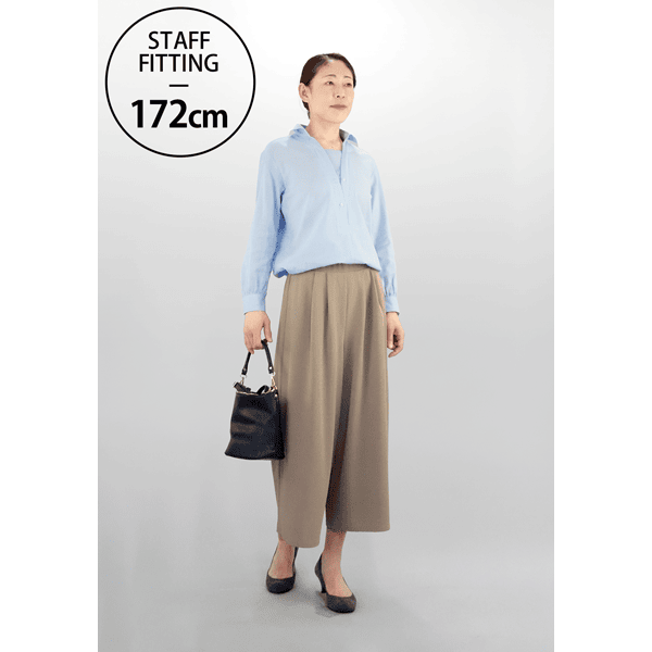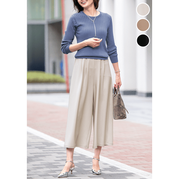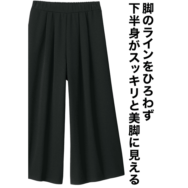 脚のラインをひろわず、スカートのように見えるワイドラインのパンツ。横に広がらずストンと落ちる生地感で、下半身がすっきりと美脚に見えます。合わせる靴を選ばない8分丈も魅力。