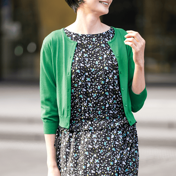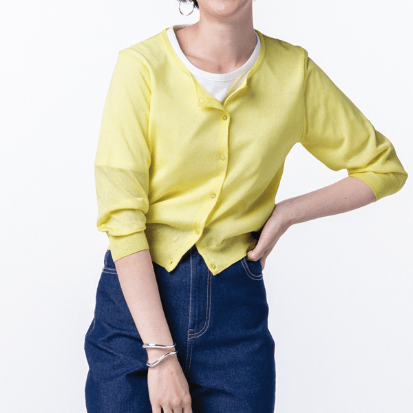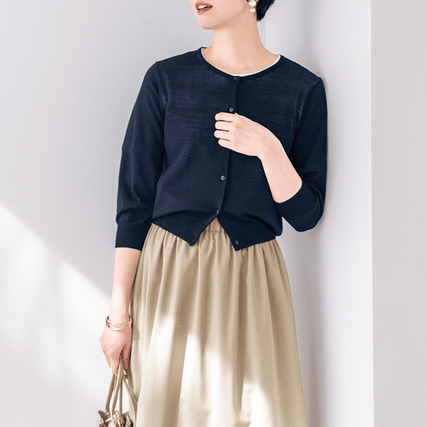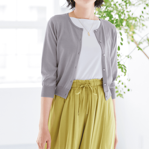 乾燥機対応に進化したエアリーカーディガン!接触冷感機能も付いて晩夏まで快適に長く着られる。