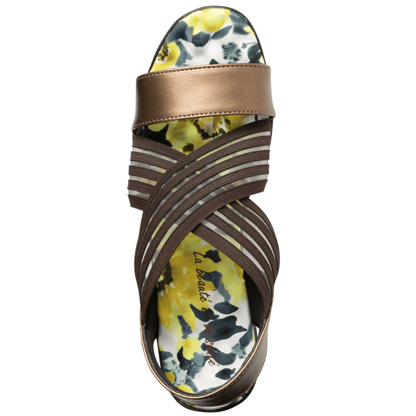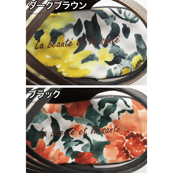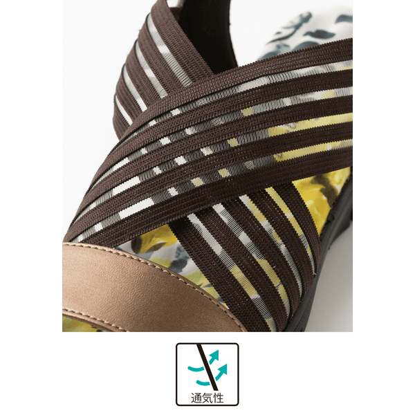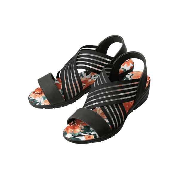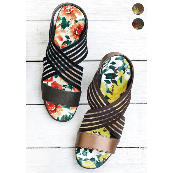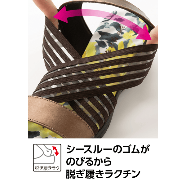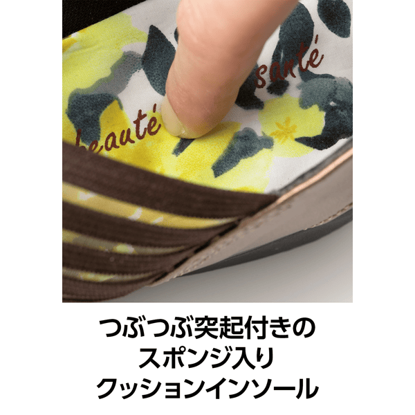 健康サンダルのような履き心地のつぶつぶ突起付きクッションインソール。フェミニンなフラワー柄と透け感のあるゴムの組み合わせが夏らしく、シースルーゴムでラクに履けて通気性もよいです。