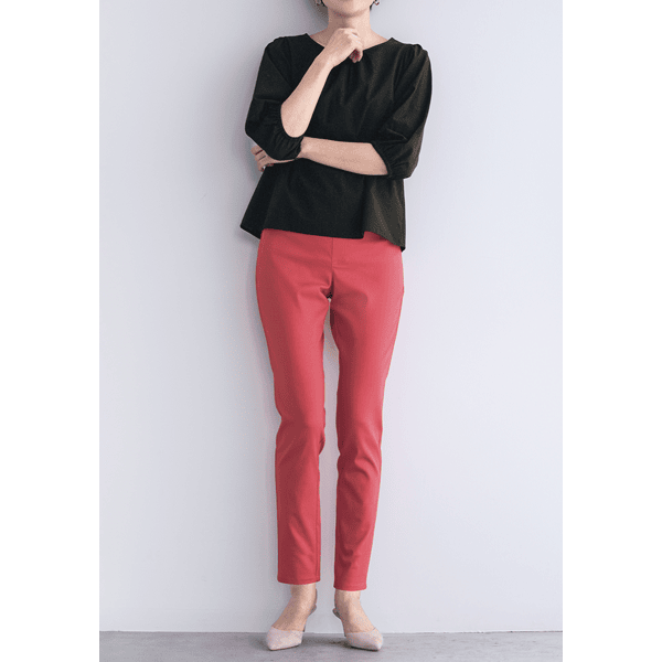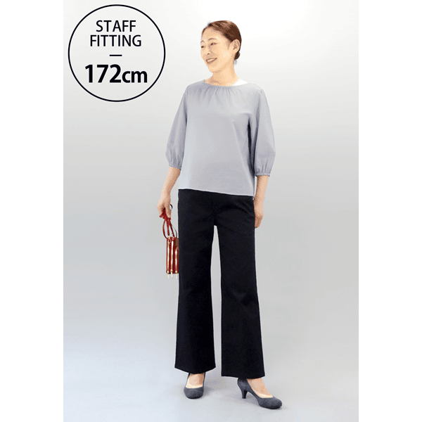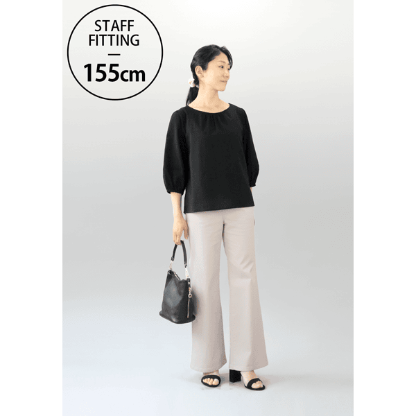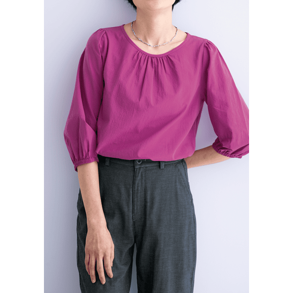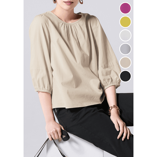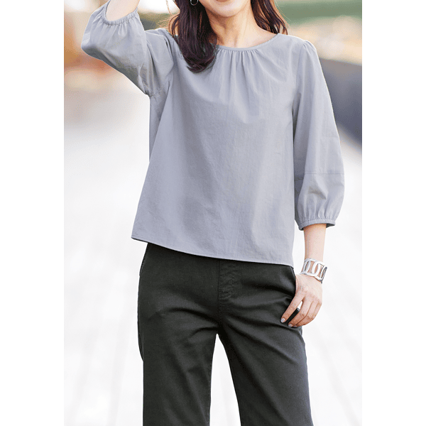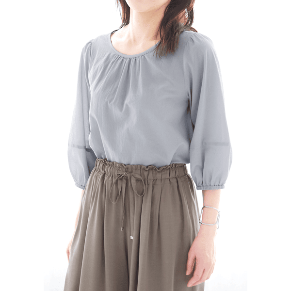 やわらかな薄手のローン生地で、涼やかなストレスフリーの軽い着心地が魅力。ギャザーを入れたふんわりとしたシルエットで体型カバーもかなうブラウスです。