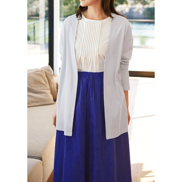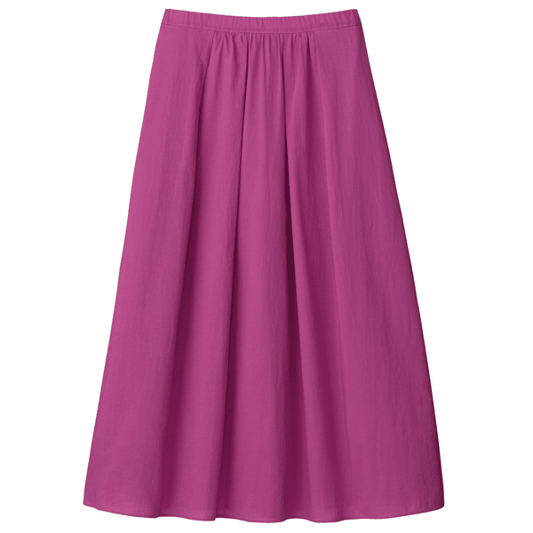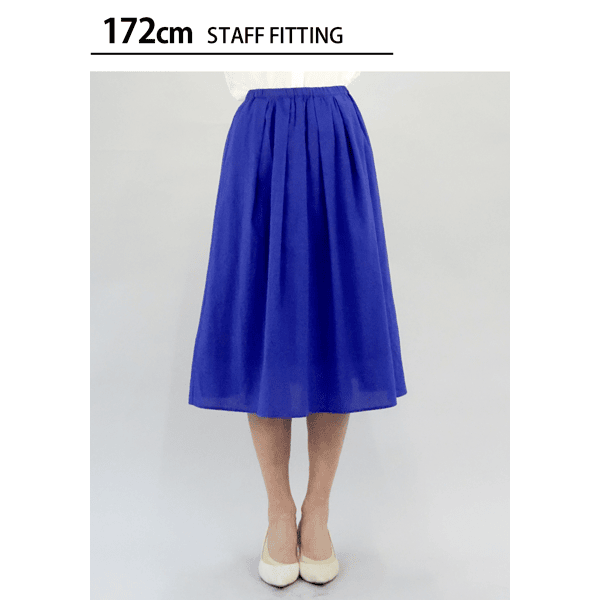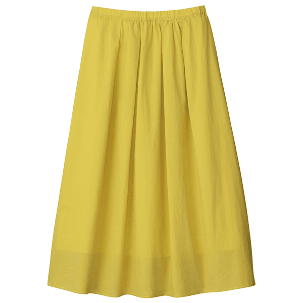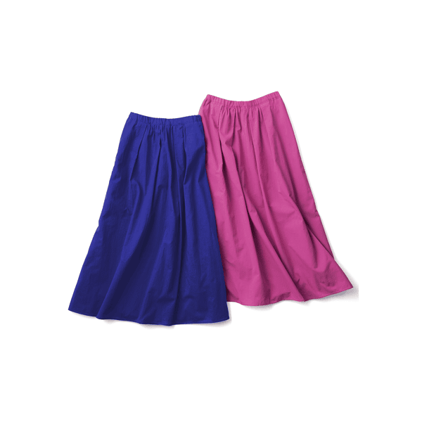 フロント中心部分にタックとギャザーを入れ、分量感がありながら腰まわりは膨らまず、すっきりと見えるデザインのスカート。目を惹く鮮やかなカラーの3色展開です。