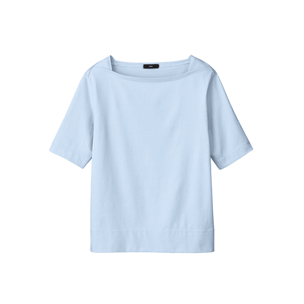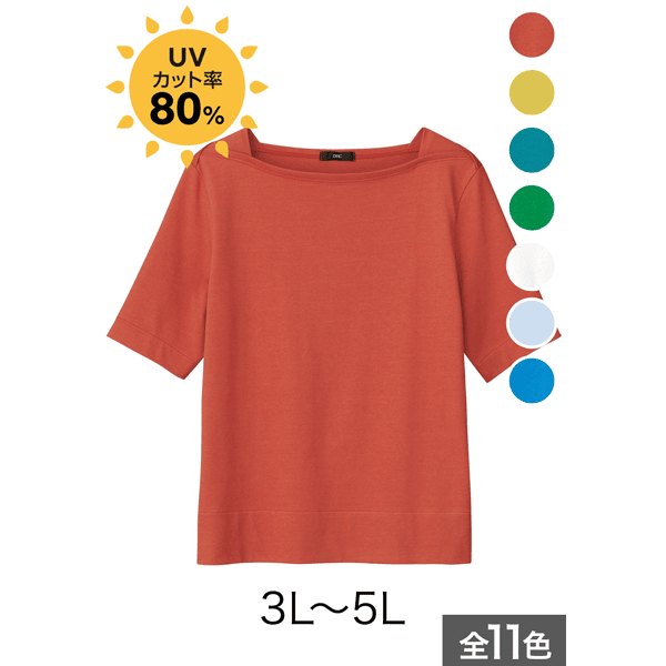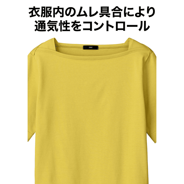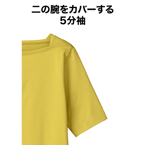 衣服内のムレ具合により通気性を自然にコントロールするいつも快適なボートネックカットソー。シンプルなデザインと豊富なカラーバリエーションで着回しやすく、二の腕をカバーする5分袖もうれしいです。