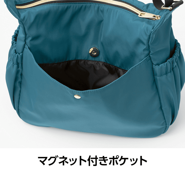 - 仕様/開閉:ファスナー式 ショルダー:長さ調節可・取り外し不可 前面:ファスナーポケット 中面:オープンポケット×2 ファスナーポケット 背面:マグネット付きポケット 脇:オープンポケット×2