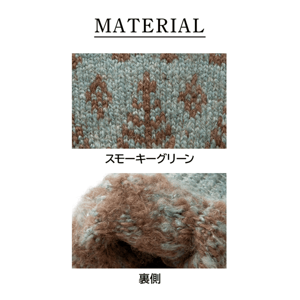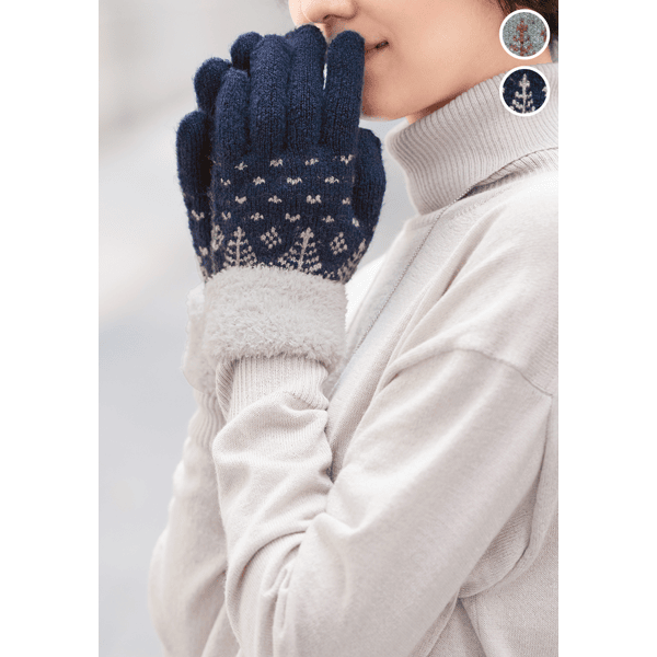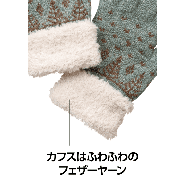 手を入れた瞬間ふんわりあたたかい着け心地のニット手袋。主張しすぎないツリー柄が合わせやすくて可愛らしく、折り返しはカフス仕様で外気も入りにくいです。