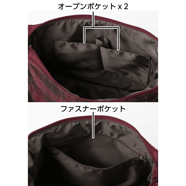 • 仕様/開閉:ファスナー式 ショルダー:長さ調節可・取り外し不可 前面:ファスナーポケット・Dカン付き 中面:オープンポケット×2・ファスナーポケット