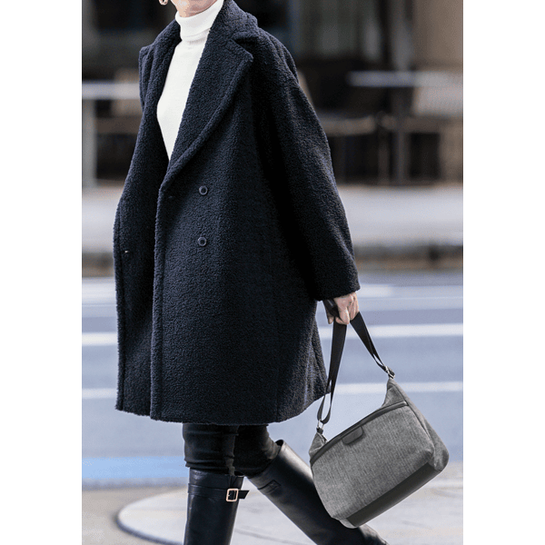 座ったときにひざの上におさまるちょうどいいサイズのショルダー。マチがしっかりあるので収納力もあります。底面は合皮素材なので汚れにくく、立ちやすいです。
