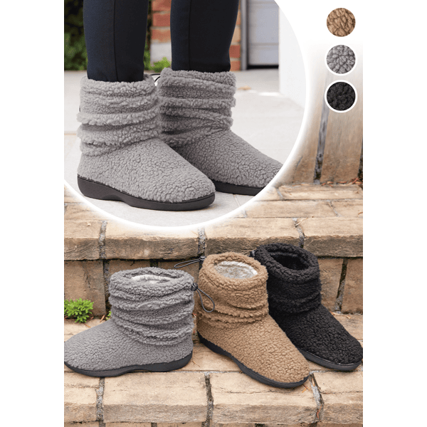 モコモコなフェイクボアに、内側もフェイクファーでソールも軽いミドル丈ブーツ。履き口後ろにストッパー付きのゴム仕様で足首をぴたっと包みます。冷え性の方に◎。