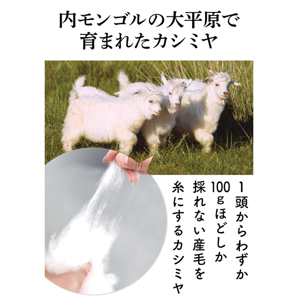 非常に繊細で、しなやかで軽くとてもやわらかなカシミヤ。上品な光沢があり保温性にも優れています。