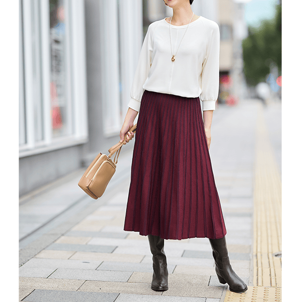 かつて、またたく間に売れていった人気のニットスカートが復活。ニットだからラクにはけるのに、品よくきれい見えがかなうのが最大の利点。そのうえ放射状に見える立体的な配色ラインが、気になる腰まわりをすっきり見せます。おまけにニットなのに洗濯機で洗えるので秋冬に重宝します。